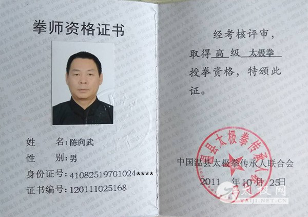 太极拳拳师资格证,是拳师授拳资格、技术水平的证明。经专家评审委员会评审,陈向武精通太极拳套路、器械教学,深入了解太极拳拳理拳法,并具备独立完成太极拳教学任务的能力,参加过国际国内及省级(含省级)以上太极拳赛事,取得优异成绩,特颁发《高级拳师资格证书》。 太极档案 陈向武,字润英,1970年出生于太极拳世家,为陈家沟陈氏二十世,陈氏太极拳12代嫡宗传人,师承陈东海,国际太极拳文化传播大使、国家武术七段,国家一级武术裁判、国家武术段位制指导员,国家武术段位制考评员、汕头市一级武师、汕头市非物质文化遗产保护工作专家委员会委员。 1990起先后在国际、国内比赛中夺得金牌二十余枚,银牌三十多枚。 1992年即在陈家沟武术馆任教,先后应邀在辽宁、江苏、南京、广东等地授拳 1993年应邀在广东汕头创办“尚武太极拳培训基地”、“尚武太极拳馆”,所授学员三万余人,夺得各项金牌400余枚、银牌300余枚。 1994年被列入《太极拳名师录》、《陈氏太极拳志》、1999年列入《中国民间武术家名典》。 2000年出版《陈氏太极拳拳械、推手技击》教学光盘。 2003年出版陈氏太极拳一路、二路、国家竞赛套路、太极内气养生功、太极单剑、双剑、太极单刀、双刀、太极枪、太极推手、太极球等整套十六项教学光盘。 2005年5月参加“潮、深、港、澳武术交流大赛”,任大赛竞赛部主任、副总裁判长。 2006年8月18日,“汕头市金味杯武术精英大赛”任裁判长。 2007年1月在“汕头市首届武术交流大会”任组委会主任兼副总裁判长。 2007年10月 “粤东、深、港、澳武术大赛”任副总裁判长兼太极推手裁判长 2008年8月“广东省传统武术锦标赛”,担任大赛技术监督部副主任。 2008年10月“首届潮汕太极拳国际邀请赛”任组委会执行副主任兼竞赛处主任。 2009年8月带队并参加由中国对外友好协会组织的“国际太极文化传播大使”,“尚武太极拳馆”11人荣誉入选“国际太极文化传播大使” 2010年6月 应温县文化局之邀,代表陈家沟小架太极拳参加山西省举办的“太极拳名家表演”并荣获“太极拳名家”称号。 2010年10月3号 陈向武在河南温县陈家沟接受中央电视台专访。 2010年12月 编撰《陈鑫太极拳法图解》一书,并拍摄《陈鑫太极拳法》教学光碟附书出版发行。 2011年8月 被评选为“中国非物质文化遗产杰出传承人”。 2011年10月 受中国文化部邀请代表中国传统文化赴意大利进行武术交流。 2001年至今先后在广东惠州、梅州、潮州、汕头潮阳区、澄海区以及江苏南京、山东潍坊、济宁、四川崇州、等地分别开设尚武太极拳分馆 2011年7月,“首届大潮汕邓老凉茶杯武术百馆精英大赛任竞赛处主任,兼裁判长。 2012年5月,由新加波、马来西亚组织的“世界太极拳王 太极拳后”比赛,担任副总裁判长兼裁判长。 2012年10月,广东省潮州市“华夏杯武术大赛”担任裁判长。 2015年10月17日,“粤东首届体育健康运动大会”任副总裁判长兼裁判长。 现任温县太极拳研究院副院长、陈鑫太极拳研究会会长、尚武太极拳馆全国总部馆长兼总教练、汕头市太极拳总教练。 责任编辑:太极网小田 |