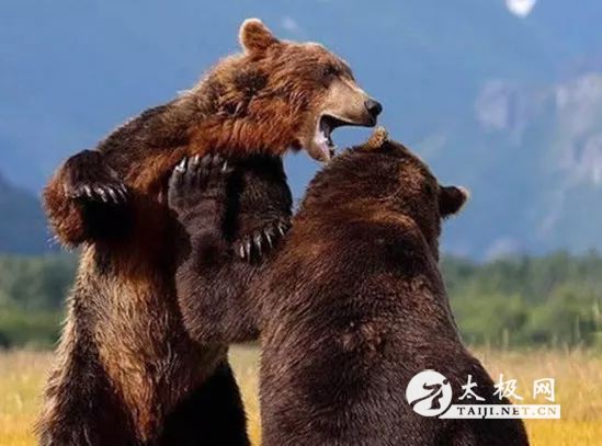 老虎豹子走路屁股高高耸起,一撅一撅的,身体是个S形,整体就像个弹簧,随时窜出去。人在后天只会用胳臂腿,不知道用腰胯,那里的骨头也长死了。但人是直立的,老虎豹子是卧着的,怎么把腰胯的横力通过脊柱转移到两臂上去呢?就是所谓劲上脊背了。 老虎豹子的脊柱方向和四肢方向是一致的,所以来自腰胯的力量可以很顺畅地传递到四肢,但是人的肩臂和脊柱是十字交叉的,按道理从腰胯上来的力量到这就中断了,所以普通人只会用两臂的力量,而不懂得用腰胯整体,这也就是为什么人控制不住一条发怒的二三十斤小狗的原因,因为犬科动物的脊柱与四肢也是同一个方向,所以虽然人家只有二三十斤,但肯定比人两条胳臂的劲要大。 那么我们人类就没有办法做到如猫科犬科那样的力量传导吗?有,就是打开肩背一带的筋骨结构,而这也就是形意拳“熊膀”的来历。 形意拳四象、也即“鸡腿、龙身、熊膀、虎抱头”,其中的熊膀一直被认为是所谓直立之能,但真的这么简单吗?人也有直立之能啊,干嘛要和熊学?其实熊膀是指熊在发力时把两个肩胛骨横向打开贯通肩膀,把腰胯之力顺着脊柱传导到两臂的功能。
