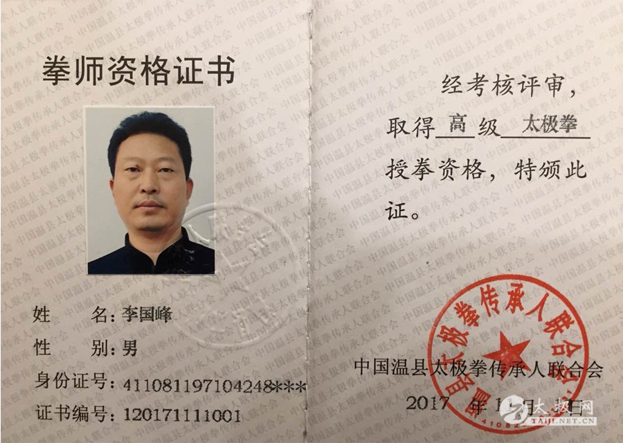 李国峰获得太极拳高级拳师证书 太极拳拳师资格证,是拳师授拳资格、技术水平的证明。经专家评审委员会评审,李国峰精通太极拳套路、器械教学,深入了解太极拳拳理拳法,并具备独立完成太极拳教学任务的能力,参加过国际国内及省级(含省级)以上太极拳赛事,取得优异成绩,特颁发《高级拳师资格证书》。 李国峰,1971年生,河南省禹州市人。自幼习武,1992年参加武警部队散打擂台赛成绩优异,1996年开始练习陈氏太极拳,师承张东武老师,陈氏太极拳十三代传人,国家武术协会会员,国际太极拳高级教练,太极拳高级拳师,2016年-2017年荣获云南省太极拳(械)锦标赛拳、剑一等奖!组织2017年百城千万人太极拳展演活动,并荣获优秀组织奖和个人优秀传播使者奖。现任泸西县太极拳协会会长,陈氏太极拳泸西县推广中心主任兼总教练,陈家沟太极拳协会云南省泸西分会总教练。 责任编辑:太极网小田 |
