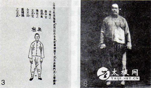 1929年出版的姜容樵《太极拳讲义》图一无极势,在“功用”里解释:“此系预备式。用以注全身,从事接演下式。且亦开门式入场礼,与少林之踏中宫相同,与操法之立正完全不同。”(图3) 1931年出版的杨澄甫《太极拳使用法》,其图示皆为杨澄甫本人的拳照,在图示一“说明”中道:“此为太极拳起势预备势动作之形态……腰胯稍松,两足距离与两肩相齐……”(图4)
