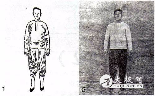 太极拳之“起势”也称“预备势”,即上场练拳的初始状。 不知从什么时候起,太极拳的“起势”变了。 放眼望今之太极拳习练者,上场打拳,先两脚并拢,呈立正状,然后左脚向左分开与肩宽齐,接着两手平举,开始第一势。 在笔者看来,这显然是错误的,因为这违背了太极拳之原理。 正确的练法应该是:上场打拳,身体自然直立,两腿分开与肩宽齐,凝神调息,洗心涤虑入静,然后两手举动,开始第一势。 有人会说,这不是一样吗。笔者要说,不一样,两者差远了! 问题的关键或差别,就在于上场一站,两腿是立正状,还是与肩宽齐的分立状。笔者竭力主张后者。 一者,笔者自几十年前学拳始,起势就是后者的两腿分立状,后来所拜访、所见识的老拳师,起势皆为两腿分立状。 二者,笔者查阅自民国时期至1965年出版的任何一种太极拳书籍,其“起势”无一例外地是两腿分立状。 比如: 1921年出版的许禹生《太极拳势图解》预备势图示之“图解”说:“身体直立,两手下垂,腕与胯齐,掌心下按,目前视,两足距离与肩之宽相等。”(图1) 1925出版的陈微明《太极拳术》图示一说:“两足平行分开,与两肩齐,眼向前视。”(图2)