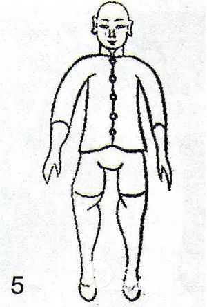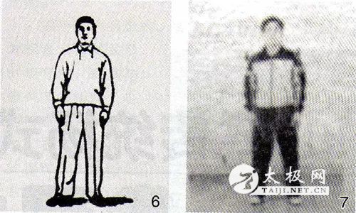 1933年出版的陈鑫《陈式太极拳图说》卷一拳势分解,第一页有两幅图像——无极像图、太极像图,两腿都是分立状,虽没有文字说明,但图示已明白无误(图5)。 1963年出版的顾留馨、沈家桢《陈式太极拳》的第一式预备势图示的文字说明:“身体中正站立,两足距离比肩略宽 ……”(图6) 就是1987年陈小旺的《世传陈式太极拳》“动作说明”第一式预备势也如是说:“身体自然直立,两足距离比肩略宽……”(图7)