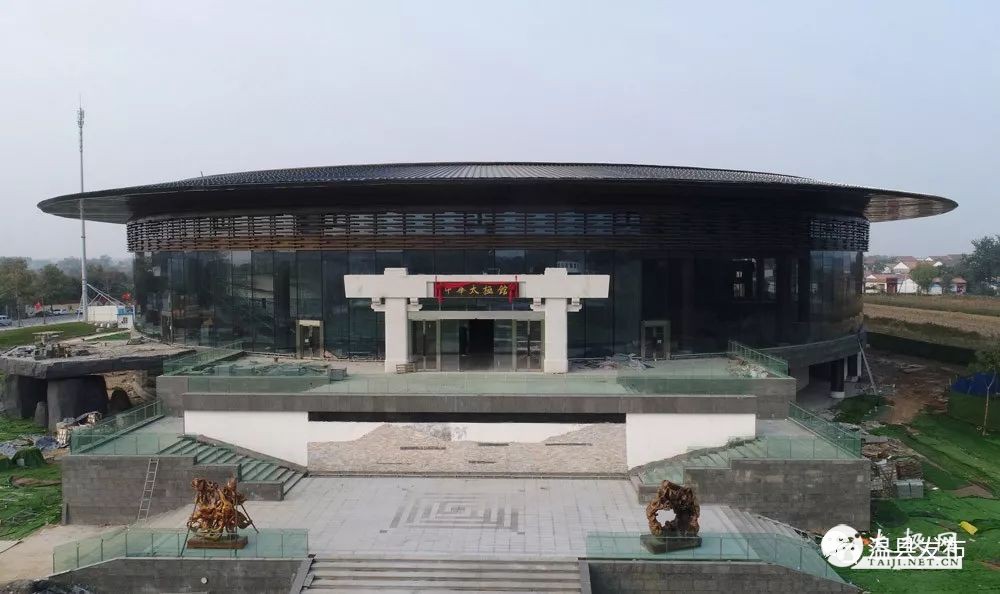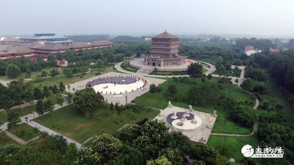 鸟瞰中国太极拳博物馆 陈家沟是闻名遐迩的太极拳发源地,位于河南温县县城东约5公里处的清风岭中段。这里是洛水清流与黄河浊波的会流之地,相传伏羲就是在这里看到两股水流一清一浊回旋激荡却泾渭分明宛然一幅天然的太极图,悟明了太极之阴阳文化。数千年后,生活在这个村庄的陈王廷,依据祖传之拳术,博采众家之精华,结合太极阴阳之理,参考中医经络学说及导引、吐纳之术,创编一套具有阴阳性质,刚柔相济、快慢相间、松活弹抖等特点的太极拳。