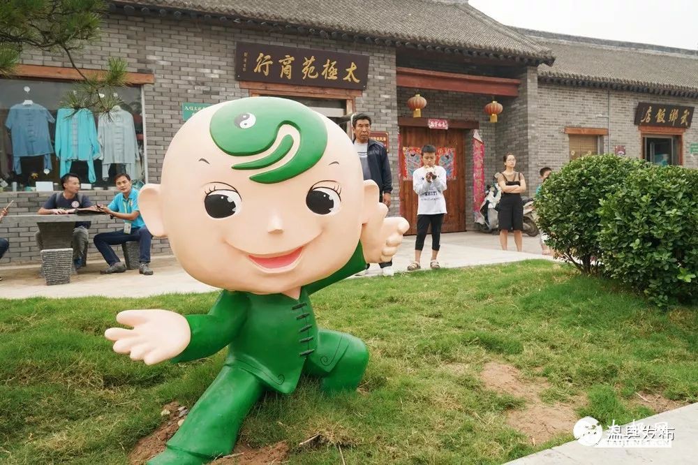 陈家沟街头小景 这是一个藏龙卧虎的地方。民谣道:“喝喝陈沟水,都会跷跷腿。”“会不会,金刚大捣碓。”这个村里,上至八十老翁,下至几岁孩童,几乎人人会打太极拳。村庄氤氲着武风侠气,步入其中脚步便霍霍生风。 无意中一回头,就能看见大门敞开的普通小院子里,一个蹒跚学步的小娃娃,打起拳来却也像模像样。“金刚捣碓!”循声望去,抬眼看见某户人家楼上的平台处,站着个金头发蓝眼睛的女子,一屈一躬,一弹一抖,如同抖掉了负重,弹来了力量。 移步易景 绿荫掩藏着无数个流传百世的动人故事。 青石铺就的主街两侧,古朴的建筑错落有致,门楼牌匾书道拳影,有种被清水濯洗过的纯净,世俗红尘皆被过滤到村庄之外。漫步其中,不时地有武校高大的门楼跃目而过,掩映在青砖黛瓦之间的家庭武校也层出不穷,连街边的商铺里,摆放着各式各样的太极服与刀枪剑戟等太极器械,满满的太极能量。
