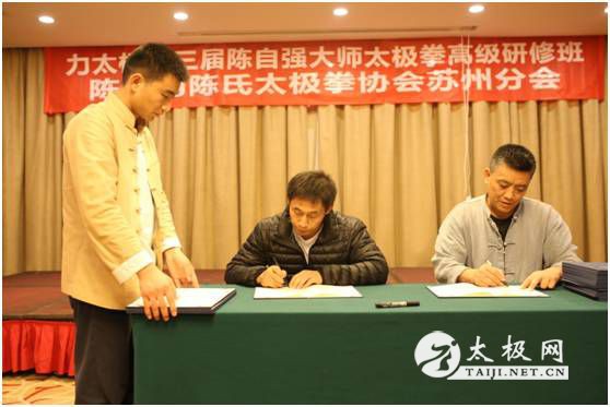 陈自强与会长马力、总教练马弟致在力太极馆 (陈家沟陈氏太极拳苏州分会) 三、面向人群: ·苏州力太极国术馆新老学员 ·各地的陈氏太极拳组织及太极拳爱好者 ·没有传染性疾病及精神系统疾病者 ·能独立完成学习任务者 ·习练过陈氏太极拳套路者 四、培训地点:待定 参加培训的学员有企业白领、高管、CEO、全国各太极拳爱好者等 主办单位: 苏州力太极国术馆、陈家沟陈氏太极拳协会苏州分会、苏州力勇体育文化有限公司 五、报名时间: 即日起至12月18日 六、报名方式: 报名电话:0512-62822278 15850336331(同微信号) QQ:2327079551 七、学习费用: 非力太极学员2500 力太极学员2000 陈氏太极拳入室弟子1800 (以上费用包含一套大师班太极服,需要提前报名统一制作) 培训期间食宿、交通、保险等个人自理。 报名地址: 苏州力太极国术馆 苏州工业园区南施街澳韵花园商业街2楼力太极国术馆 培训须知: 课前十分钟持培训证入场,课间不得随意走动、早退,保持课堂环境、安静,学习时间关闭通讯工具,培训期间请勿摄像、录音。