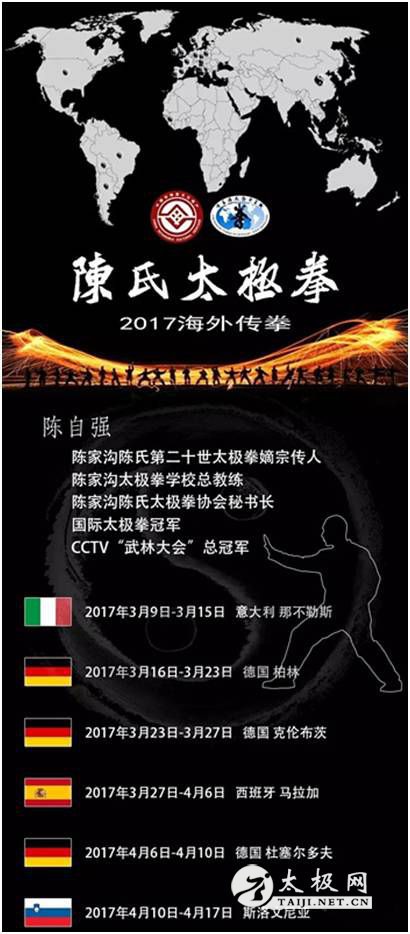 ![]() 应往年培训班参与者及广大太极拳爱好者们的强烈要求,再次邀请到: 陈氏太极拳新一代领军人、陈家沟陈氏第二十世太极拳嫡宗传人、陈家沟太极拳学校总教练、陈家沟陈氏太极拳协会秘书长、国际太极拳冠军、CCTV【武林大会】总冠军、陈家沟陈氏太极拳协会苏州分会拳术指导、苏州力太极国术馆拳术指导--国际太极拳大师陈自强老师。 2017年环球传拳归来,国内首届培训班,将于2017年12月23日、24日在苏州举办高级研修培训班,欢迎各界太极拳爱好者报名参加。