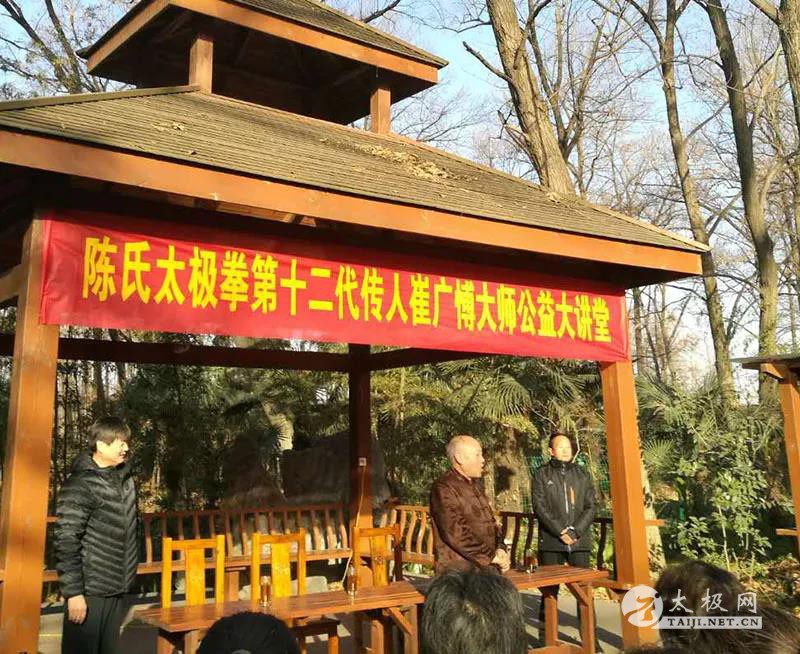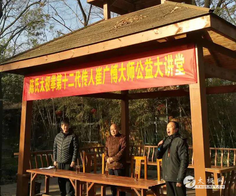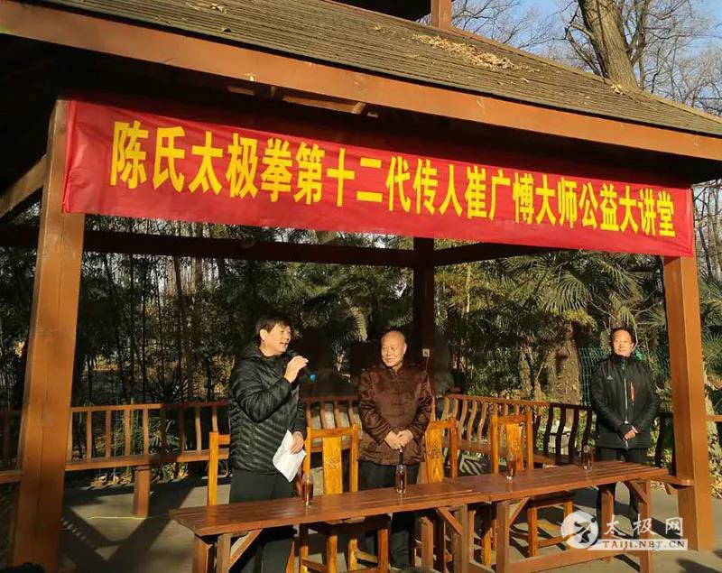 (太极网报道)2017年12月24日,陈氏太极拳第十二代传人、国际太极拳大师陈正雷弟子崔广博应同为陈正雷大师弟子的南阳市武协执行主席高东祥邀请,来到南阳武协所在地华宇俱乐部进行公益讲学。 上午九时,崔广博大师在南阳市武协执行主席高东祥、张齐军,副主席王燕燕、市武协常务副秘书长郭克兰、内设机构负责人李玉武、王昌兰、李文豪、高宝洪、王大勇、付义冲、高媛、王丽萍等人的陪同下步入公益大讲堂现场。在“陈式太极拳第十二代传人崔广博大师公益大讲堂”的横幅下,张齐军主席主持并进行了简短的欢迎仪式,高东祥主席介绍了崔广博大师的习武简历。