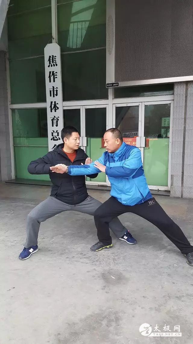 ▲杨建平(左)与焦作市王西安太极拳研究会秘书长祁俊东在演练太极推手 责任编辑:太极网安安 |