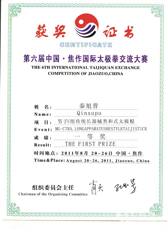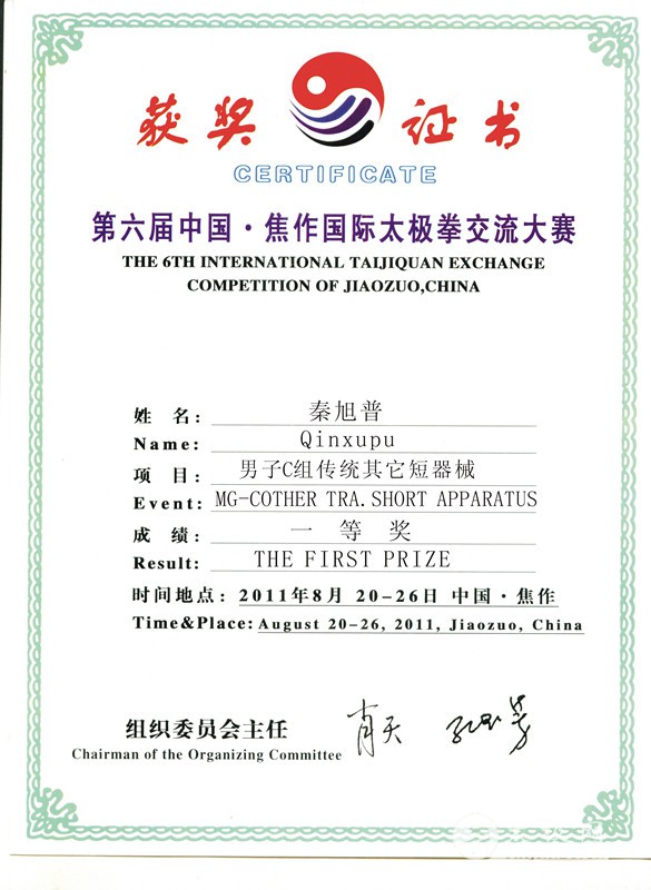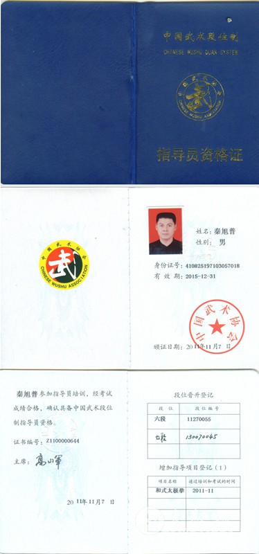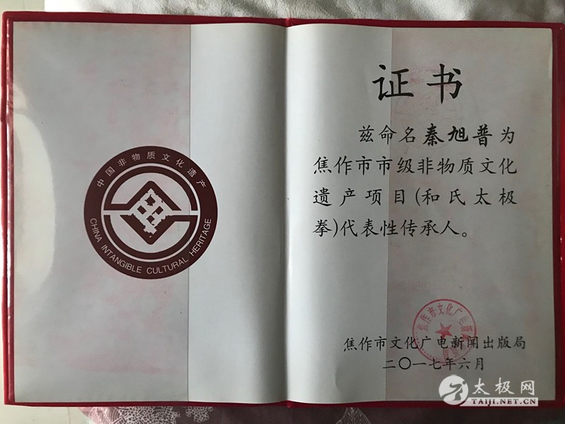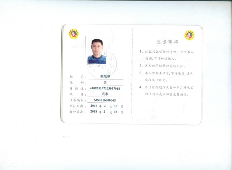九式太极功 秦旭普 秦旭普,男,汉族,1971年3月5日出生于河南省温县,研究生学历,国家级非物质文化遗产和式太极拳当代代表性传承人和有禄先生高徒,中国武术七段,和式太极拳第七代代表性传承人,全国武术功力项目教练员、裁判员,和式太极拳段位制指导员、考评员,焦作市和式太极拳协会副会长,焦作市健康生活方式社会指导员,四川省武术协会和式太极拳研究会总教练,绵阳市青少年活动中心武术部部长,绵阳市武术协会副主席,江油市和式太极拳协会总教练,达州市武术协会常务副主席,焦作市首届武术名师,四川耍之道太极文化科技有限责任公司董事长。 自幼喜好武术,秉性诚实,天资聪慧,勤奋好学,尊师重道;13岁起习拳,30余年勤学不辍,终有所成。2010年五月5日拜和有禄大师,成为入室弟子。系统全面的继承了和式太极拳及刀、剑、棍等各种器械套路、推手、散手、功法以及和式太极拳理论精髓,深得和式太极拳精妙。2008年5.12汶川大地震后作为援建干部到四川江油工作,开始传播教授和式太极拳,从学者达千余人,援建任务结束后,专职从事和式太极拳教学,使和式太极拳这一中原文化瑰宝在四川扎根发展,永远见证了豫川人民的深厚友谊,为和式太极拳在西南地区的发展起到了重要作用。 近年来多次受邀到浙江、湖北、湖南、陕西以及四川省各地市教授和式太极拳,积极响应中国武术协会段位制推广工作,率先在四川省武术协会成立和式太极拳段位制考评点,为适应新形势下和式太极拳传承需要积极探索总结经验, 2015年3月12日《中国体育报》刊登了题为《用段位制重建精神家园》文章介绍秦旭普的事迹。 2014年7月随师和有禄先生到美国肯塔基州路易斯维尔授拳。 2014年8月8日受国家体育总局武术运动管理中心邀请组队代表全国青少年参加首届全国武术运动大会段位制展演获优秀表演奖。 2015年10月受邀到美国密西根州大底特律市授拳。 2016年9月8日受国家体育总局武术运动管理中心邀请组队代表和式太极拳参加第二届全国武术运动大会段位制展演获优秀表演奖。 2016年10月受邀到美国密西根州大底特律市授拳。 2017年6月受邀参加美国华盛顿地区太极拳爱好者秦旭普推手专场交流活动。 在和有禄老师指导下创作歌曲《和式太极拳之歌》并在第四届全国和式太极拳大赛开幕式上演出发布,为和式太极拳传承和发展注入现代元素。 多年来致力于和式太极拳技击和疗病功效的理论研究,在教学中结合拳理治疗当地群众常见生理疾病,成效显著。著有《和式太极拳之三直五顺》、《传承中华太极文化规范拜师授徒仪式》、《太极拳修炼“守中用中”之三层境界》等文章并在国家级刊物《搏击》杂志发表。拳照被中国国家摄影出版社出版的大型画册《太极拳》作为代表性传承人收录。