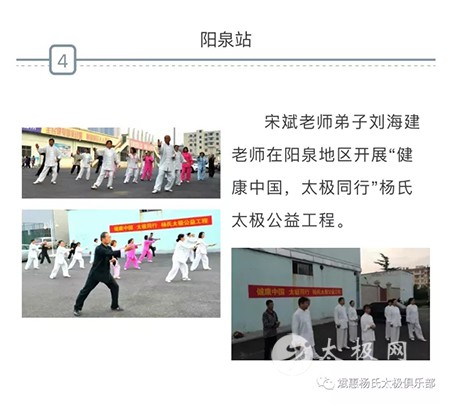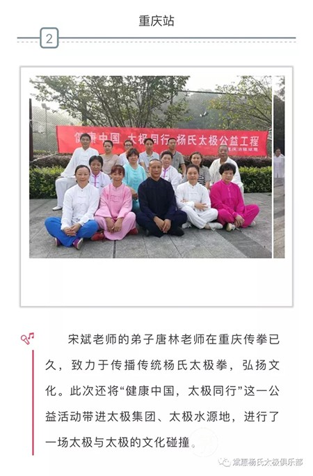 从一个人的爱好到一群人的专业 三十五年前,宋斌老师从部队转业回乡,开始接触太极拳。自幼喜武的宋老师因缘际会地了解到杨氏太极第四代嫡传杨振铎尊师就在太原定居,且常年在迎泽公园藏经楼前公开教拳。每逢周末,宋老师便乘坐将近4个小时的公交车,从汾阳前往省城跟随杨振铎老师学拳。这一学,便是将近四十年。 三十多年来,环境在变,交通在变,不变的是宋斌老师一心学艺、教拳传拳的那份初心。 国家武管中心主任高小军、山西省体育局领导在山西省杨氏太极拳协会调研。摄于迎泽公园藏经楼前。前排左三为杨振铎尊师,前排右一为杨斌老师。 宋斌老师陪同师父、师母及段英莲老师登顶泰山。 自1997年开始,时任汾阳市杨氏太极拳协会总教练的宋斌老师就开始了一年一度的大型公开义务教拳。三十年来,从无间断,每年暑假,为期一个月的传统杨氏太极拳培训班,培养了上万人次的太极拳爱好者,让数以万计的群众从中获益。真正秉承了杨振铎尊师“为全人类健康做贡献”的号召和宗旨。 南下广州、上海传拳后,宋斌老师也将这一传统带了过去,每周至少一次,在公园、广场公开义务教拳,进一步推广传播。 【图为汾阳、上海、广州的公益课】 三十多年来,宋斌老师不仅奋斗在教学第一线,大力推广、传播传统杨氏太极;更是不遗余力的培养了一大批的骨干教练和精英,无论走到哪儿,都是一支亮眼的队伍。 三十多年来,宋斌老师不断总结自己的教学经验,并结合曾在部队教导队的教导方法,不断完善着自己的教学体系。上至耄耋老人,下至黄口小儿,无论是为了强身健体,还是为了技击防身,总有一套适合你的方法。 “二三四一教学法”应运而生。 “二”指两心,一为恭敬心,即对杨家历代宗师以及老师保持恭敬心;二为尊敬心,即师生之间、同学之间互相尊重。 “三”指三德,一为公德,即遵守社会公德,遵纪守法;二为手德,不轻易与他人动手过招,对他人的展示、表演予以掌声鼓励;三为口德,不口出狂言、不辱骂他人,不轻易评价其他人、其他门派、其他拳种。 “四”包含两个三位一体相结合的教学总结:第一个三位一体指招式详解、推手应用、技击攻防三位一体相结合的教学;第二个三位一体指在招式详解的过程中通过步型步法、身型身法、手型手法三位先分开进而合为一体的学习方法。 “一”指通过对太极理论的学习和对太极技艺的实践,进一步追求精气神合一、道术合一、身心合一。 2015年-2016年,宋斌老师的“二三四一”教学法太极课程连续荣获全国高校精品课程优秀奖,适应性强、效果显著的教学方法受到了广泛的欢迎和高度的肯定。 用所有人都能听懂的方式去教授太极、传播太极,是宋斌老师及其团队多年来一直在坚持的一件事情。 从一个个人的爱好,逐步发展到一群专业教练的事业,正应了那句话“不忘初心,方得始终”。 是传承者,更是传播者 2002年,宋斌老师有幸被杨氏太极第四代嫡传人杨振铎尊师收为首批入室弟子,成为杨氏太极第五代传人。 2014年,宋斌老师在汾阳举办首次收徒仪式,有七位弟子拜入门下,最远的来自巴西。 2017年,宋斌老师在上海再次收徒,有来自江西、湖南、湖北、福建、浙江、广东、重庆、上海以及山西多地的共28位弟子拜入门下,队伍逐渐壮大。 正月期间,宋斌老师带着弟子一行前往太原拜访杨振铎尊师,向师父汇报在外工作进程以及新年的工作展望,杨振铎尊师也表示了对斌惠团队在外传播、教授传统杨氏太极工作的肯定和赞扬,并教导我们继续努力,坚持为大众服务,使杨氏太极更加繁荣昌盛,为全人类的身体健康做贡献。 看望杨振铎尊师 近年来,国家大力扶持传统文化的重新发扬光大,更是不遗余力的打造太极拳健康工程,在全国范围内进行推广。《健康中国2030规划纲要》中明确提到“重点扶持推广太极拳、健身气功等民族民俗民间传统运动项目”。 为响应国家扶持政策,响应杨振铎尊师“健康中国,太极同行”的号召,作为传承人,成长为优秀、合格的传播者,更加迫在眉睫。 三十多年来,宋斌老师始终坚守教学岗位,更是不遗余力的传播和推广。只要有平台,就去讲太极。不仅仅是讲拳、教拳,更多的是从传统艺术和文化的角度去分享和交流,吸引更多的年轻人关注、加入。一步步打造太极精品项目,树立太极品牌形象;坚持贯彻太极拳六进项目,即进学校、进社区、进乡镇、进企业、进机关、进军营,服务基层百姓。 2009年,宋斌老师应邀陪同师父师母前往美国田纳西州纳什维尔参加国际杨氏太极拳协会成立十周年庆典暨首届国际太极拳高峰论坛,受杨氏太极振铎系第五代嫡传掌门杨军老师任命,成为杨澄甫太极拳汾阳中心主管,随之在山西省汾阳市开设杨澄甫太极拳汾阳中心-汾阳斌儒堂,由此展开了在汾阳周边乃至山西的教拳步伐。 2014年,宋斌老师再次携学生前往美国肯塔基州路易斯维尔参加国际杨氏太极拳协会十五周年纪念暨第二届国际太极拳高峰论坛,回国后宋斌老师毅然决定辞去工作,南下广东开设广州斌惠堂,开始了在珠三角地区的全职化、专业化的传拳、教拳活动。 2015年,宋斌老师率弟子前往上海教拳,2016年开设上海斌惠堂,开始了在长三角以及周边地区的传拳、教拳活动。 2009年美国纳什维尔 2014年美国路易斯维尔 2017年,宋斌老师及其团队的传拳足迹更是遍布全国各地。 以上