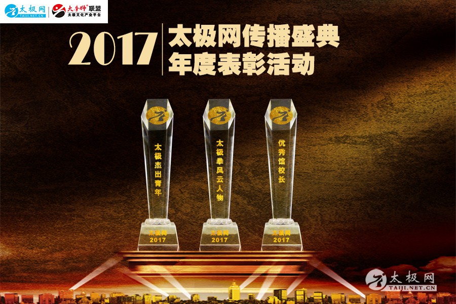 2017芳华已逝,回望过去的一年,太极拳这一深受世界各地人民喜爱的中国优秀非遗文化代表项目取得了长足的发展,越来越多的人加入到习练太极拳的队伍中来,通过太极拳收获健康与快乐。2017年,太极拳的传播和推广继续突飞猛进,太极拳发展欣欣向荣。 2017年,广大太极拳爱好者为太极拳的推广和传播不懈奋斗,在世界范围内涌现出了一大批朝气蓬勃的“太极拳杰出青年”,在全国各地开办拳馆武校传拳育人的“优秀馆校长”,以及引领太极拳发展潮流,走在太极拳事业发展最前沿的“太极拳风云人物”,他们在2017年为太极拳的传播发展做出了极其突出的贡献! 当前,太极拳的传播与推广形式已不再局限于传统的线下发展,互联网传播尤其是自媒体端的巨大优势,使得太极拳这一神秘宝贵的健身养生项目走向世界的每一个角落,越来越多的人通过网络了解、认识太极拳,通过网络学习、交流太极拳,通过网络,成为“太极人”。 太极网(taiji.net.cn)是创立于1997年的专业太极拳门户网站,自建立以来,立足太极拳发源地温县,多年来致力于太极拳的传播与推广。为积极挖掘和表彰并鼓励在2017年度太极拳传播推广领域表现突出的传承人、拳师,太极网与大拳师联盟共同发起举办“2017太极网传播盛典年度表彰活动”,充分结合当前“互联网+太极拳”传播新形势,挖掘和表彰2017年度太极拳界传播和推广太极拳表现突出的“太极杰出青年”、“优秀馆校长”、“太极风云人物”,与广大拳友共同见证太极拳的勃勃生机! 通过网络我们看到,一大批朝气蓬勃的“太极拳杰出青年”不断冲斥着太极拳界,引发拳友强烈关注和喜爱,有颜值有拳技的太极青年军,致力于太极拳的传承与传播,是太极拳发展的坚强后盾。 通过网络我们看到,那些为太极拳传播推广而不懈努力的太极拳传承人、拳师,他们可能是新生代的敢于作为的太极拳师,可能是默默奉献的资深太极拳师,不仅通过线下传拳影响着广大拳友,也通过线上网络传播影响着广大拳友。他们是太极拳传播推广上引领浪潮的风云人物。 通过网络我们看到,众多以传承传播太极拳为己任的太极拳馆校长开馆办校,传拳育人,他们是太极拳传播发展的中坚力量!只要您的拳馆武校有一定的规模,传播教授的学员弟子有一定规模和水平,在网络和当地有一定的影响力,“2017年十大优秀太极拳馆校长”等您来挑战! 太极网传播盛典年度表彰活动组委会现接受广大太极拳传承人、拳师的公开报名,资料提交截止后表彰活动组委会专家评审。届时,组委会将评选出“2017太极网传播盛典年度表彰活动“之”十大太极杰出青年”、“十大风云人物”、“十大优秀馆校长”,并向获奖者颁发相关荣誉奖杯及证书。后期以太极网全媒体推广为传播手段,将获奖者的太极风采进行最大范围的传播和推广