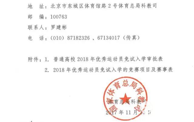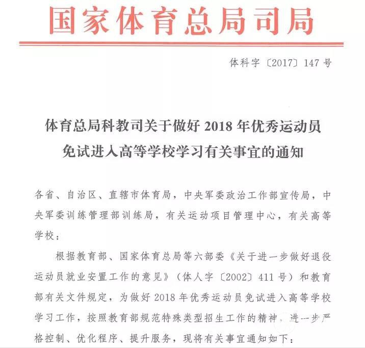 各省、自治区、直辖市体育局,中央军委政治工作部宣传局,中央军委训练管理部训练局,有关运动项目管理中心,有关高等学校: 根据教育部、国家体育总局等六部委《关于进一步做好退役运动员就业安置工作的意见》(体人字〔2002〕411号)和教育部有关文件规定,为做好2018年优秀运动员免试进入高等学校学习工作,按照教育部规范特殊类型招生工作的精神,进一步严格控制、优化程序、提升服务,现将有关事宜通知如下: 一、免试运动员条件 (一)符合2018年高考报名条件,并取得生源所在地高考报名号; (二)办理正式招收手续、工资关系在体育系统运动队且工资实行运动员基础津贴和成绩津贴(职业运动员不受此条件限制); (三)运动成绩优异,满足以下任一条件: 1.曾获指定项目比赛最高级别组(见附件2)全国前三名、亚洲前六名、世界前八名,武术套路传统项目运动员需同时获得运动健将等级称号; 2.获得足球、篮球、排球、田径和武术项目运动健将称号; 3.获得国际级运动健将称号。 二、申报材料 (一)《普通高校2018年优秀运动员免试入学审批表》(附件1)(扫描件或照片); (二)高中毕业证书或同等学力证明(扫描件或照片); (三)符合免试资格的比赛获奖证书(扫描件或照片); (四)身份证(正面照片); (五)电子照片(证件照)。 三、办理程序 (一)申请免试入学的运动员必须参加生源所在地省级招生考试部门组织的高考报名(具体按各省级招生考试部门要求执行); (二)申请免试入学的运动员应根据院校招生简章,自行联系拟申请就读高校,并填写《普通高校2018年优秀运动员免试入学审批表》,获得学校招生部门盖章同意; (三)申请免试入学的运动员征得招生院校同意后,于2018年3月1日12:00前在中国运动文化教育网或网站APP(体教联盟)的“优秀运动员免试入学系统”(以下简称免试系统)进行报名,并根据系统要求提交相关资料,逾期不予以受理; (四)省(自治区、直辖市)体育局、中央军委体育管理部门,以及体育总局各运动项目管理中心于2018年3月5日-20日12:00前通过“免试系统”管理终端完成运动员资格审核,审核后打印纸质《审核汇总表》(系统提供打印)盖章后,于3月31日前报体育总局科教司,逾期不予以受理; (五)通过审核的推荐名单将由在中国运动文化教育网及网站APP(体教联盟)上进行公示; (六)推荐名单经教育部批准后,由相关省级招生管理部门和高校按规定办理录取手续。 四、有关要求 (一)各省(自治区、直辖市)体育局、中央军委体育管理部门、运动项目管理中心和高校要加强对优秀运动员免试入学工作的管理,严格按照有关文件规定对运动员资格和条件进行审核,积极开展推荐优秀运动员免试进入高校学习工作; (二)高校接收优秀运动员免试入学,必须认真审核运动员填报的《普通高校2018年优秀运动员免试入学审批表》,对运动员就读专业进行明确,并做好招生专业确定和计划预留;符合条件的运动员可免试进入高校体育学类本科专业,如运动员申请就读其他专业,应参加运动训练、武术与民族传统体育专业单独招生文化课考试,由高校自主划定文化课录取分数线。 体育学类本科专业:体育教育、运动训练、社会体育指导与管理、武术与民族传统体育、运动人体科学、运动康复、休闲体育 (三)每位运动员只能获得一所高校许可,若被两所以上高校同时批准录取,应在报名前选择一所高校,并主动告知放弃的高校招生部门,征得放弃院校招生部门同意,否则将取消入学资格; (四)运动员若在申报过程中弄虚作假,经查实,取消当年申报或录取资格,已入学者,取消其入学资格,并视情节轻重,依据《国家教育考试违规处理办法》(教育部33号令)进行处理; (五)申报冰球、棒球、垒球和橄榄球项目免试入学的运动员将在2018年运动训练单招统一考试期间进行专业水平复核,具体安排另行通知。 |