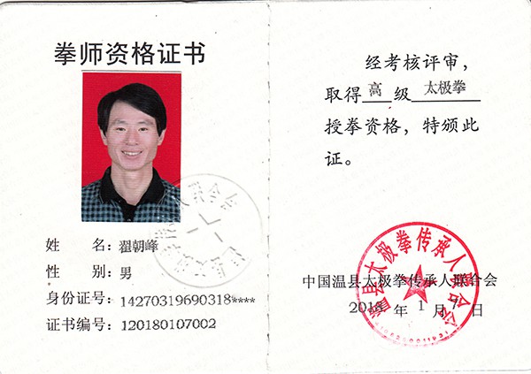 太极拳拳师资格证,是拳师授拳资格、技术水平的证明。经专家评审委员会评审,翟朝峰精通太极拳套路、器械教学,深入了解太极拳拳理拳法,并具备独立完成太极拳教学任务的能力,参加过国际国内及省级(含省级)以上太极拳赛事,取得优异成绩,特颁发《高级拳师资格证书》。 翟朝峰,生于1971年,山西省河津市人。 1981年开始习练武术,1988年开始习练传统杨氏太极拳至今约30年 2005年拜在杨氏太极拳第四代嫡传人杨振铎老师门下,成为杨氏太极拳第五代传人。 2007年接任河津市武术协主席至今。 自1991年至2002年期间参加全国及省、市太极拳比赛,获得杨氏太极拳国际邀请赛及省、市太极拳比赛拳、剑、刀全能冠军。 从事太极拳教学25年,2011年成立了河津市振铎杨氏太极拳社。 2017年在山西运城成立了振铎杨氏太极拳社。同时注册了振铎太极文化资询服务有限公司。 2013年在QQ网络公开授课引起社会太极拳爱好者广泛关注与好评。 2015年于山西省朔州市成立了杨氏太极拳会馆。 自2011年开始走向专业化教育教学发展道路,在运城、朔州、昆明、海南等地成立了分支机构。在不同地点开展公益教学活动50多场次,参与人参上万人。培养弟子、教练20余人。培养骨干50余人。从1995年至今授课参与人数5万多人。 责任编辑:太极网小田 |