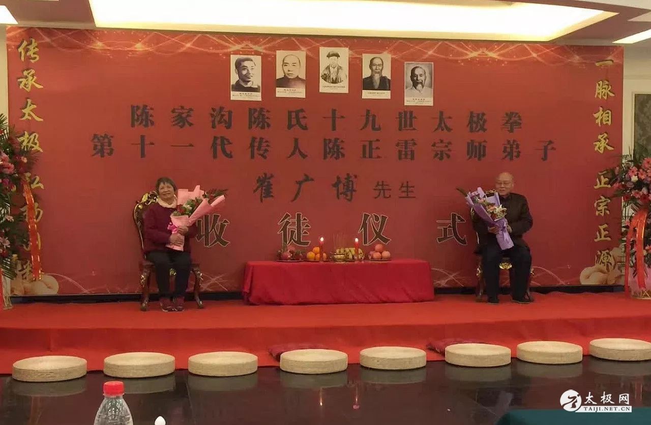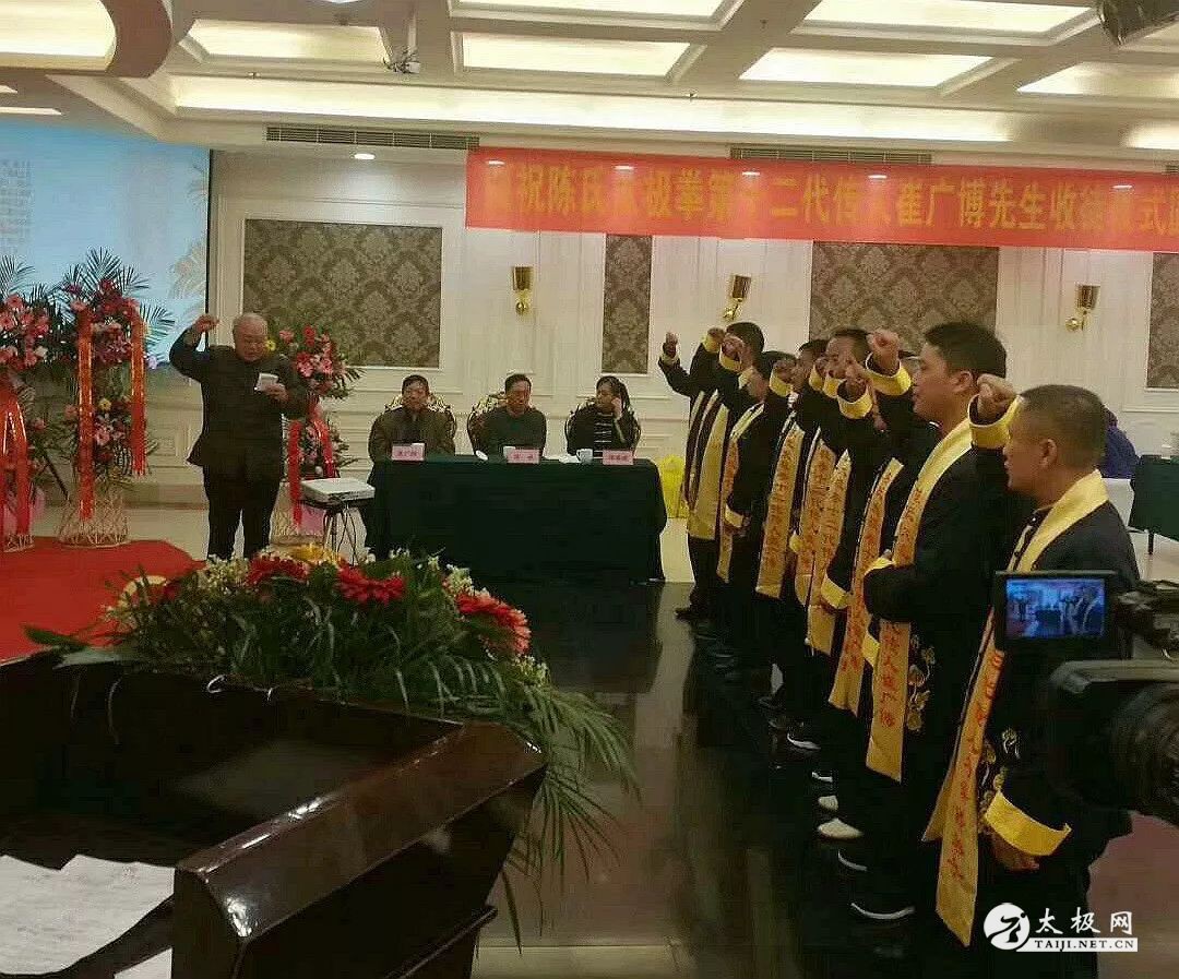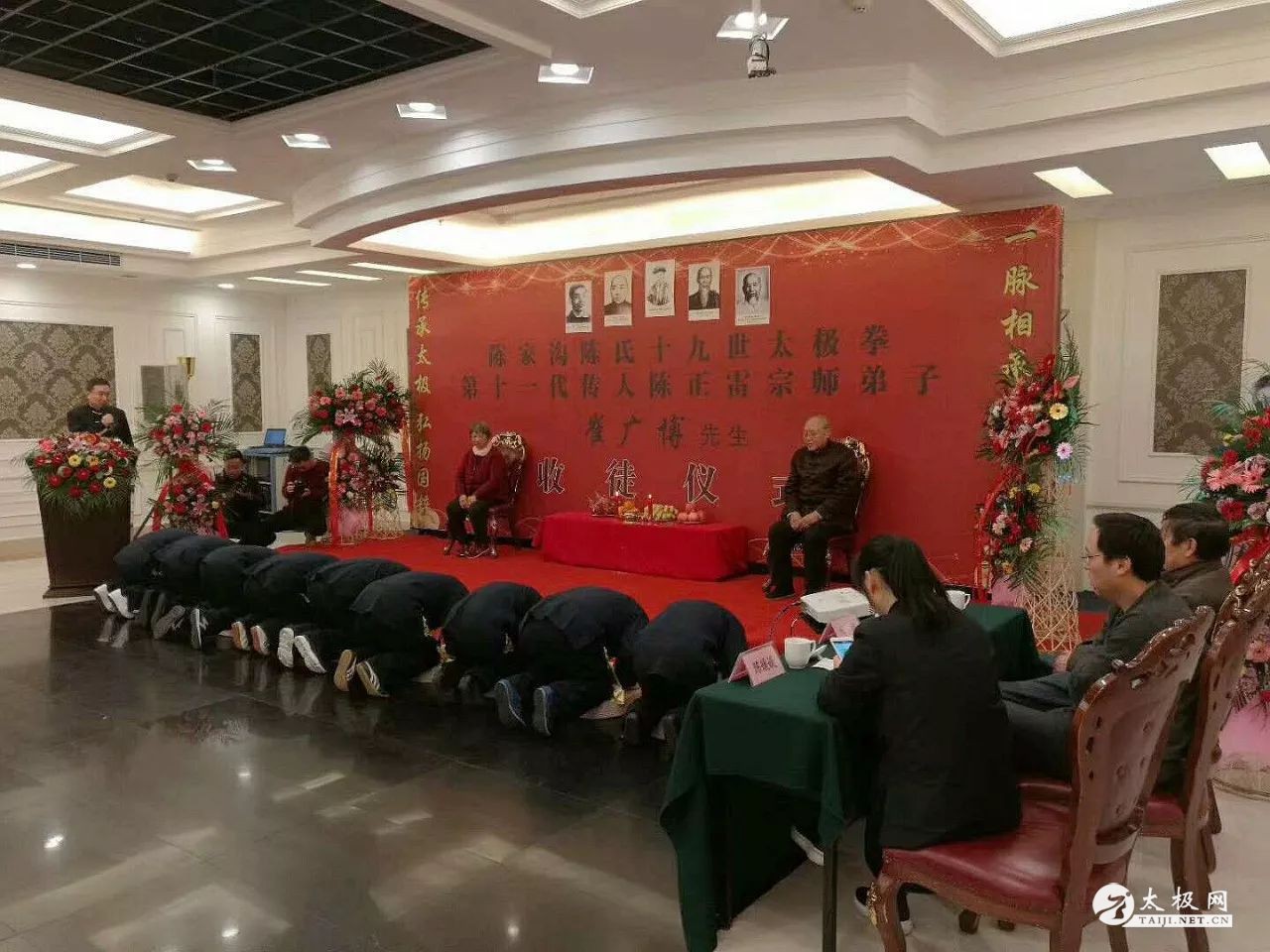 (太极网报道)2018年元月8日上午,郑州光华大酒店热闹非凡、高朋满座,到处洋溢着欢快、喜庆的气氛,陈家沟陈氏十九世·太极拳第十一代嫡宗传人陈正雷先生弟子——陈氏太极拳第十二代传人崔广博老师收徒仪式在此隆重举行!