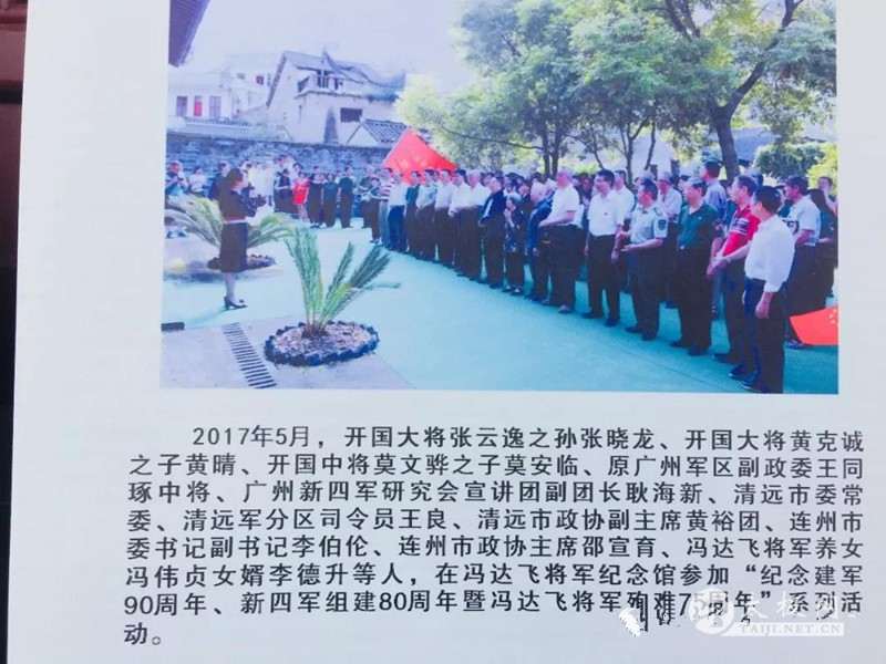 连州属于粤北之地,前几天的大幅度降温,这里也飘起雪花,结起薄冰,映衬着青山绿水,别有一番风情。拳友们到来,天气逐渐转晴,正午阳光普照,暖洋洋的照在人身上,很是舒服。午饭过后,在副镇长的陪同下,一行人步行前往参观冯达飞将军纪念馆。 当年新四军途经东陂镇,伟大的总设计师邓小平曾经坐过的桌椅板凳,还被完好的保存着。说到这里,必须提起一位不遗余力促成我们此次连州行的无冕英雄-耿海薪博士。他是红军的后代,少年入伍,军营历练。不惑之年远赴澳洲,考取MBA学位。归国后继续投身学习,以54岁的年龄拿到经济学博士。他致力于研究新四军研究,撰写材料,各处宣讲,传播新四军铁军精神。当了解到连州籍烈士冯达飞将军的事迹后,更是往来奔波,在他的努力下,终于在2017年11月,将冯达飞将军的名义刻在了空军英烈墙上。 前排右三即为耿海薪博士 耿海薪博士是广东省老干部大学太极班的学员,是大家的好拳友。努力学习太极之余,他热心太极事业的发展,也正是在他的牵头和带动下,才有了此次的连州之行。而这样一位有大爱之人,却不幸离世。听闻如此噩耗,每个人都悲痛万分,此次活动也差点夭折。广州国之旅的何总,同时也是耿博的战友,奔波多地,积极联系,又联系到了连州负责人,才再次组织起这次旅途。