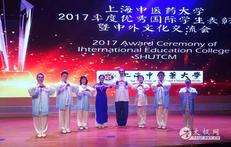 【易正与拳友们表演杨氏太极拳】 (太极网报道)2018年1月12日,上海中医药大学举办2017年度优秀国际学生表彰大会暨中外文化交流活动。 大宋体育太极上海站的学员易正,来自伊朗,非常热爱中国的传统文化,夫妻二人不远万里来到中国,在上海中医药大学求学,学习中医之余,也在拳馆跟随宋斌老师,以及宋老师弟子任琳、何良敏、唐玉霞等其他教练系统的学习传统杨氏太极拳、剑、刀以及推手等。每逢宋老师到上海以及周边参加交流活动,也都会带着易正前往。 作为一名国际友人,他对中国传统文化的热爱和追求也总会鼓舞其他人。此次交流活动,任琳老师也亲率拳馆其他弟子教练,共同前往。 【任琳与易正表演杨氏太极剑】