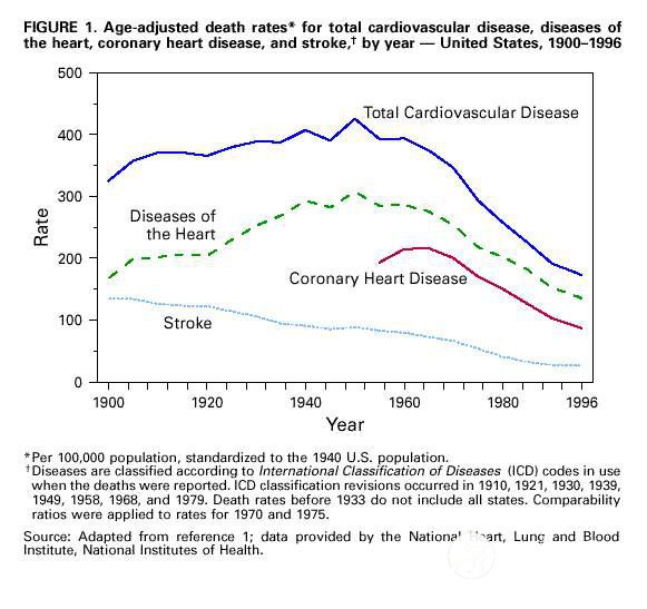 自1921年以来,心脏病就成为美国民众的头号杀手。中风(脑卒中)则从1938年成为第3号杀手,二者合在一起简称心血管疾病(cardiovascular disease,CVD),占美国人死亡的40%。 可喜的是自1950年以来,通过种种预防措施以及医疗条件的改善,美国心血管疾病的死亡率下降了60%。尽管如此,迄今每年仍然有70万名美国人患突发性心脏病,被幸运抢救过来的病人则需要长时间的康复。