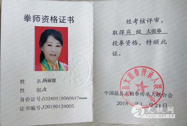 杨丽媛获得太极拳高级拳师证书 太极拳拳师资格证,是拳师授拳资格、技术水平的证明。经专家评审委员会评审,杨丽媛精通太极拳套路、器械教学,深入了解太极拳拳理拳法,并具备独立完成太极拳教学任务的能力,参加过国际国内及省级(含省级)以上太极拳赛事,取得优异成绩,特颁发《高级拳师资格证书》。 太极档案 1、中国武术协会会员; 2、国家武术六段位; 3、国家武术二级裁判; 4、社会体育指导员; 5、中国武术段位制考评员; 6、中国武术段位制指导员; 7、取得陈家沟太极拳功夫学习陈式太极拳执教资格证; 8、获2014年“中国·丽江国际武术文化节”陈式太极拳二等奖、女子器械二等奖; 9、获2014年“中国·丽江国际武术文化节”优秀教练员奖; 10、获2016年“中国·丽江国际武术文化节”陈式太极拳一等奖; 11、获2016年“中国·丽江国际武术文化节”优秀教练员称号; 12、获2016年“七彩云南全民健身工程”女子老年组段位拳二等奖; 13、红塔集团卷烟厂工会聘请为武术教练; 14、昆明市华藏教育学校聘请为武术教练; 15、第二届国际太极拳网络视频大赛一等奖; 16、2016年度“最美太极人”。 责任编辑:太极网小田 |