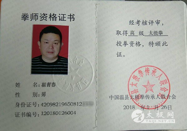 崔青春,出生1965年8月22日,湖北省安陆市赵棚镇崔沟村人,自育好武,青少年时多次参加民间舞狮,玩龙灯,打拳,舞棍活动。2008年开始习练太极拳,2014年相识陈家沟太极拳传人孟凡老师,跟随他修练深造,在他精心陪教导下,受益匪浅,深得精髓。2016年春正式拜孟凡为师,决心全身心参悟修练,为陈氏太极拳的深造和推广贡献力量。 习练期间,多次参加省,市,县级太极拳精英赛活动,多次荣获比赛金牌,银牌,荣获比赛一,二等奖十多次。 |