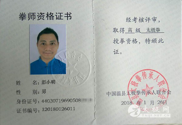 彭小明,1969年出生于深圳市坪山,自幼喜爱习武,1999年开始习练陈式太极拳、械、推手及内功。 2015年正式拜太极名家——孟凡为师。后多次参加广东省深圳市武术比赛,荣获多次太极拳、械、推手金奖。并多次在大型活动中应邀表演。还兼任多家太极拳社会组织团体顾问、理事等职。希望将太极拳发扬光大!宏扬太极精神! |