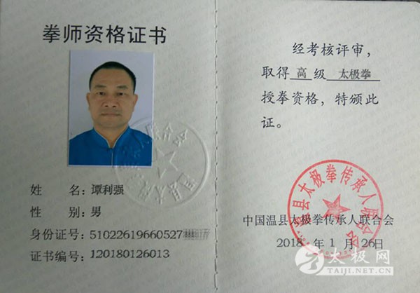 谭利强,性别男,民族汉,出生1966年5月27日,住址重庆市北碚区东阳街道桃花山村骑龙穴组9号附1号。身份证号码510226196605278817。 1988-1989年在四川江油重华海灯法师武校习武。 1990-1991年跟武术家张云雷学习搏击散打。 2010-2014年跟孟凡师父学习陈式28、老架一路、二路、56式、春秋大刀、太极剑太极推手等。 2014年7月叁加广东省第七届武术精英大赛获太极拳金奖春秋大刀第一名。 2014年11月叁加深圳市太极拳(器械)比赛获太极拳金奖、春秋大刀金奖。 2014年12月通过太极拳四段位考核获得证书。 2015-2016年学习陈式太极拳新架一路二路。 2016年12月叁加首届珠三角地区太极拳交流大赛获得乐龄乙组陈式太极拳金奖。 2016年获得国家三级社会体育指导员证。 2016年12月31日通过太极拳五段位考核获得证书。 |
