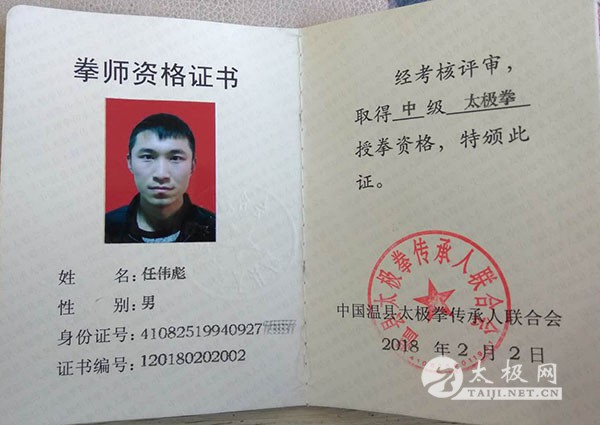 任伟彪获得太极拳中级拳师证书 太极拳拳师资格证,是拳师授拳资格、技术水平的证明。经专家评审委员会评审,任伟彪有一年的辅助教学经验,能完成太极拳套路教学任务,参加过市级(包含市级)以上太极拳赛事,取得前三名的,特颁发《国际太极拳高级教练证》。 师承尊古太极陈有则老师。 2010年太极拳年会60㎏推手第四名;2012年被聘请38军66325部队太极拳总教练;2014渭南市太极拳协会教练;2017上海市推手比赛65kg第一名;现任上海浦东新区启武培训中心主教练。 |