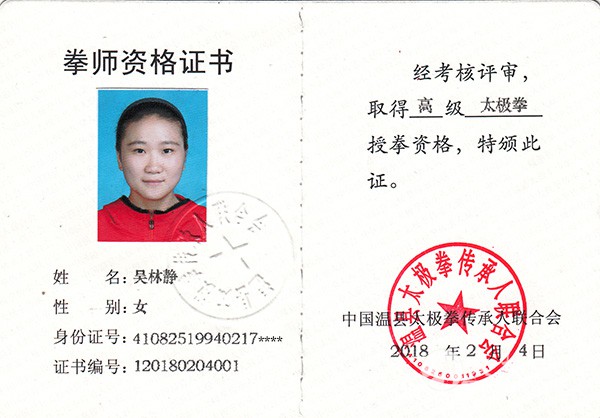 太极拳拳师资格证,是拳师授拳资格、技术水平的证明。经专家评审委员会评审,吴林静精通太极拳套路、器械教学,深入了解太极拳拳理拳法,并具备独立完成太极拳教学任务的能力,参加过国际国内及省级(含省级)以上太极拳赛事,取得优异成绩,特颁发《高级拳师资格证书》。 荣誉经历 1.2011年参加焦作市“凯莱杯”武术锦标赛,获得女子陈氏传统拳第二名,女传统剑第三名。 2.2012年参加焦作市“翼彪武校杯”武术锦标赛,获得陈氏太极单刀第四名;女子陈氏传统第二名,并荣获“国家二级运动员等级称号。 3.2013年参加河南焦作第七届国际太极拳交流大赛,获得女子陈氏传统拳一等奖,女子陈氏太极单剑一等奖。 4.2014年参加首届“陈正雷太极年会”,获得女子陈氏传统拳一等奖,传统太极单剑一等奖。 5.2013年获得二级社会体育指导员资格证。 6.2013年获得武术教练员岗位证书。 7.2012年获得授拳资格证A级。 8.2014年参加第六届中国陈家沟太极功夫精英赛获得女子青年组陈氏太极单剑二等奖。 9.2014年获得国家二级裁判员 10.2014年参加第六届中国陈家沟太极功夫精英赛获得女子青年组陈氏传统老架一等奖。 11.2015年,在第八届国际太极拳交流大赛中,获得女子C组陈氏老架一路一等奖。 12.2015年,在第八届国际太极拳交流大赛中,获得女子C组陈氏传统太极剑二等奖。 13.2015年,在第八届国际太极拳交流大赛中,获得拳械混编团体赛第一名。 14.2015年,在温县第二十一太极拳、剑推手锦标赛比赛中被评为优秀裁判。 授拳经历 1.2009年暑假在温县庆州武院当助教。 2.2010--2012年暑假均在温县庆州武院代课。 3.2012年进入河南理工大学成为河南理工大学太极拳协会总教练。 4. 2015年,在河南理工大学实习两个月,主要负责大一的体育课,上课内容为陈氏太极拳精要十八式。 5.2016年在北京元海太极拳文化传播有限公司任陈式太极拳教练。 6.2017年福建省晋江市清风太极文化传播有限公司任陈式太极拳教练至今。 责任编辑:太极网小田 |