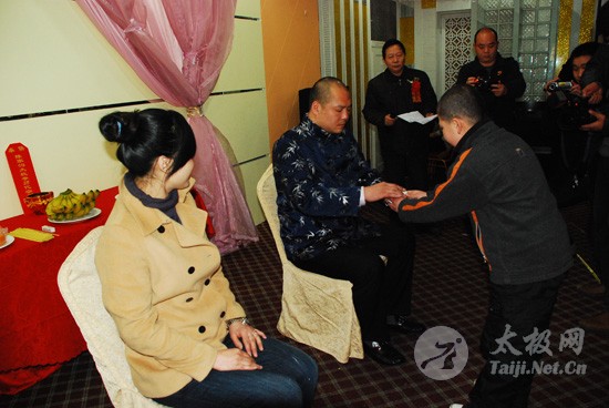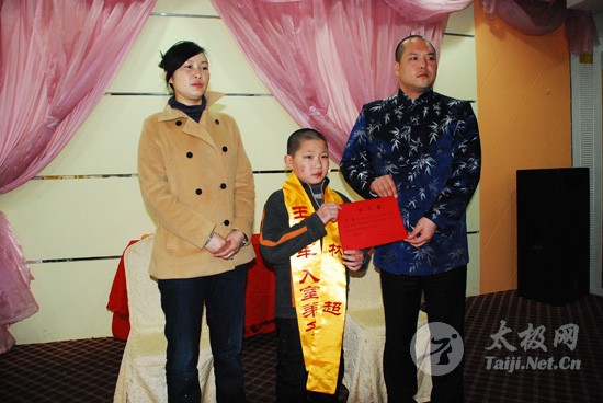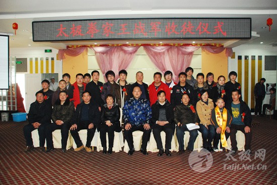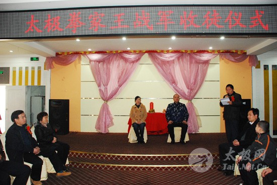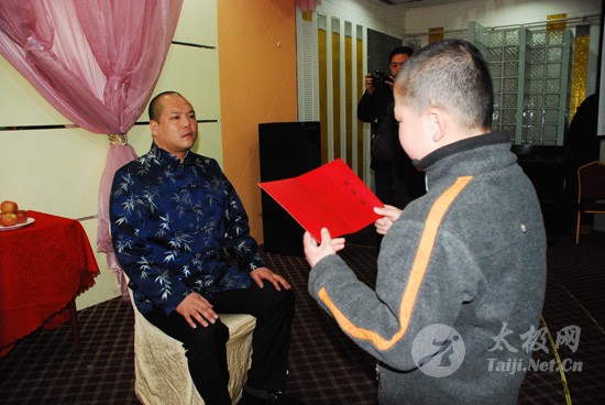 | (太极网简讯)庚寅年正月初九,太极拳大师王战军先生收徒仪式在温县银苑大酒店二楼举行。来自浙江省瑞安市的陈家沟武术院学生林超,受其父影响,对太极拳情有独钟,自愿拜入太极拳大师王战军门下,成为王西安拳法第三代传人。 收徒仪式由陈家沟太极拳推广中心执行秘书长张胜利主持,温县体育局局长宋明军、教育局局长原玉芹等见证了收徒仪式。