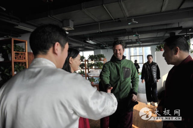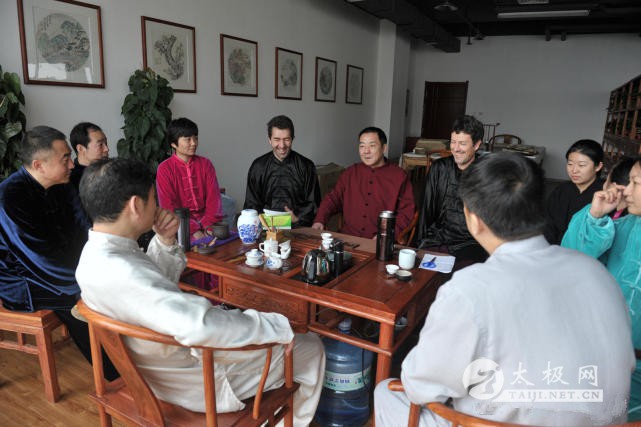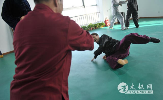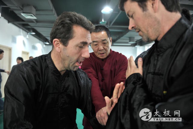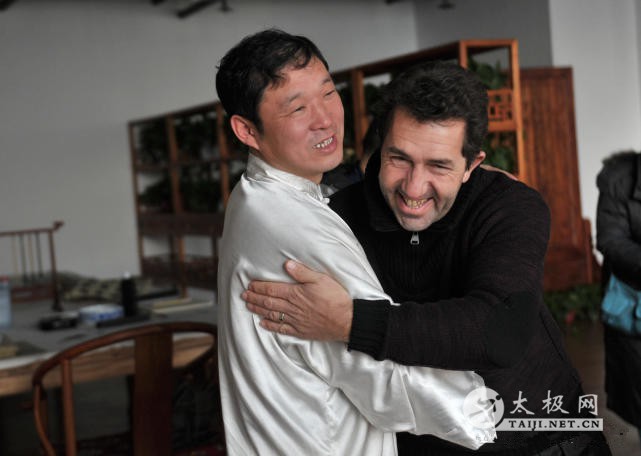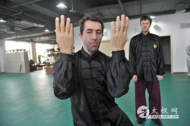 (太极网报道)2月5日上午,西安东郊一家太极拳馆迎来了两位高鼻梁、蓝眼睛的外国人,俩人在陈氏太极传人陈西鹏老师的带领下,和其他学员一起在专心练习太极拳。 温森特来自法国,今年44岁,在法国是一位化妆品经销商,学习太极拳已经有7年时间,这次是他第二次专程到西安拜师学艺。 埃瑞克也是来自法国,今年41岁,他的职业是一位冲浪教练,据他介绍,他7年前就开始喜欢太极拳,这次来西安拜师学艺是他的第四次西安之旅。 63岁的陈西鹏老师,是陈氏太极拳第十二代传人,从小跟随父亲陈全忠学拳,如今弟子已经遍布世界各地,前来拜师学艺的络绎不绝,今天,两位法国弟子再一次从千里之外来到拳馆,让他格外高兴。 温森特性格十分开朗,当得知自己的同伴是一位帆船教练时,立刻做出敬仰的动作,然后用双手模拟帆船冲浪的动作,形象告诉中国的朋友埃瑞克的职业。 两位来自法国的太极拳爱好者使用的语言是法语,老师和他们交流遇到了困难,好在团队里有懂英文的学生,师生之间和弟子之间可以用简单的英文交流。埃瑞克还不时地学习汉语,来中国这四次也学会了不少汉语单词。 温森特和埃瑞克在法国同一家中国太极拳拳馆里学拳,虽然同在一个城市,但他们并不认识,这次分别来到中国拜师学艺,并在同一个老师门下,让俩人十分惊讶,俩人很珍惜这次相识,抓紧点滴时间切磋交流。 埃瑞克在法国学太极拳时,就萌发要到中国来学习的念头,他说,太极拳发源中国,学习太极拳就一定要到发源地去,这样才能学到正宗的太极拳。 温森特和埃瑞克都是自费到陈师傅拳馆学习,每次都要在拳馆学习半个月之久。两人学习十分刻苦,休息时还在一起切磋练习,让很多中国的学员感动。