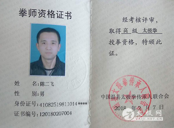 陈二飞获得太极拳高级拳师证书 太极拳拳师资格证,是拳师授拳资格、技术水平的证明。经专家评审委员会评审,陈二飞精通太极拳套路、器械教学,深入了解太极拳拳理拳法,并具备独立完成太极拳教学任务的能力,参加过国际国内及省级(含省级)以上太极拳赛事,取得优异成绩,特颁发《高级拳师资格证书》。 陈二飞字宜林,陈氏太极拳第十一代传人。自小练习太极拳,2006年拜入陈氏太极拳大师朱老虎门下,专业修习陈氏太极拳传统套路。2014年到周庄开办宜林太极社,属于陈家沟朱老虎太极功夫院周庄宜林太极分会。陈家沟朱老虎太极功夫院优秀教练,温县太极拳优秀教练,2008年北京,2012年浙江,2014年江苏授拳至今。 责任编辑:太极网小田 |