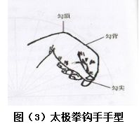 “钩手”的作用从任何拳术的技击意义上讲都是擒拿技法,其主要技术技势是叼、拿、锁、扣,太极拳的钩手也不例外。 “钩手”在太极拳推手或者散放时得机得势地叼、扣、锁、拿住对方肩、肘、手、腕等部位,使其进入死角状态而不能进行转换变化。钩手有抓筋、拿脉、锁骨、截劲等作用和功效,使被“钩”者痛彻肺腑、有深透入骨之感。钩手叼、拿、锁、扣技法如果与击、打、跌、放综合起来运用,更能体现太极拳技击特有的威力和魅力。 但是,如果以图1所表示的钩手手形来体现太极拳“钩手”的神奇威力,那是基本办不到的。太极拳应有太极拳的钩手,而太极拳的钩手是根据太极拳独有原理和技击要求而设计并得到实践检验的。 那么,什么是太极拳正确的钩手呢? 太极拳钩手手形用文字表述应为:手腕自然下垂,先小指,依次无名指、中指、食指蜷曲,拇指贴于食指梢节,小指紧贴掌根缘,卷曲掌中为空心,成为钩手(见图3)。