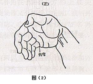 凡是拳术,大多都有钩手。掌、拳、钩是“手”在拳术中的基本手形,在技击搏斗中各自有不同的作用。掌、拳的作用无须多言,钩的作用主要用于擒拿。于是就有了专司擒拿技艺的“钩手”。 其手形:五指依次并拢,拇指背朝上,其余四指微向掌心弯曲,并以小指为主,顺小指一侧的掌缘屈腕为钩。这种手形的特点不见明显的钩尖,而是四指尖形成锯齿状,故而也称为“锯齿钩手”(见图2)。