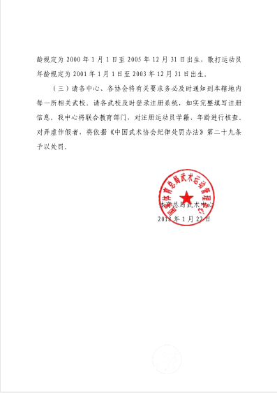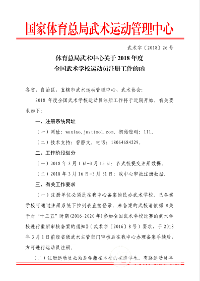 现将“体育总局武术中心关于2018年度全国武术学校运动员注册工作的函”转发给你们,请你们按照要求和时间节点,积极做好注册申报工作。注册成功后,请将注册结果及时反馈给温县太极拳武术文化管理中心和温县体育局武术科。
