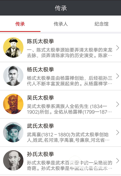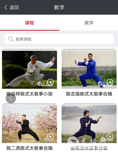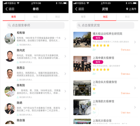 【传承查阅】以“书太极拳史,立传承人传”为宗旨,以太极拳传承谱系工程数据库为核心,实现各流派太极拳传承人移动端在线认证查询以及展示个人传承和图文视频等,概览太极拳传承脉络及文化。 三、拳师拳馆界面 【轻松找】可根据人名、地区、师承关系来检索传承人及馆校等信息,轻松查找名师名家。基于GPS位置服务为用户精选展示当地拳师及馆校信息等,可一键导航、一键通话。 四、教学界面