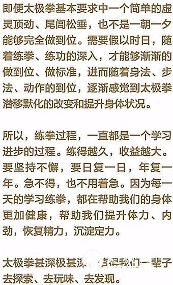 年纪渐长,拳龄渐增,才发现,输和赢,以及平手,并不是最重要的。最重要的,是我们要通过不断地参访不同门派的前辈们,更深入的理解太极拳的基本原理,探索太极拳的奥秘。这些内容是我们明火执仗的上门挑战,所没办法获得的。 练拳久一点儿,总会有自己的体会和收获,而且会愿意和别人分享、探讨。但每个人都有想赢怕输的心理。太计较输赢,只能令自己失去从交流中获益的机会,更失去从不同侧面深入了解太极拳的机缘。因为,太极拳甚深极甚深。我们大家,哪怕是当代的很多太极拳名师和高手,都在不断地探索的领悟。 因而,永远不要说:太极拳我会了。最多只能说:太极拳,我会一点儿。或者说:太极拳,我学了几多年…… 哪怕是二三十年的太极拳修炼,也只能是略知太极拳的一二,难以深入到太极拳的精髓实质。