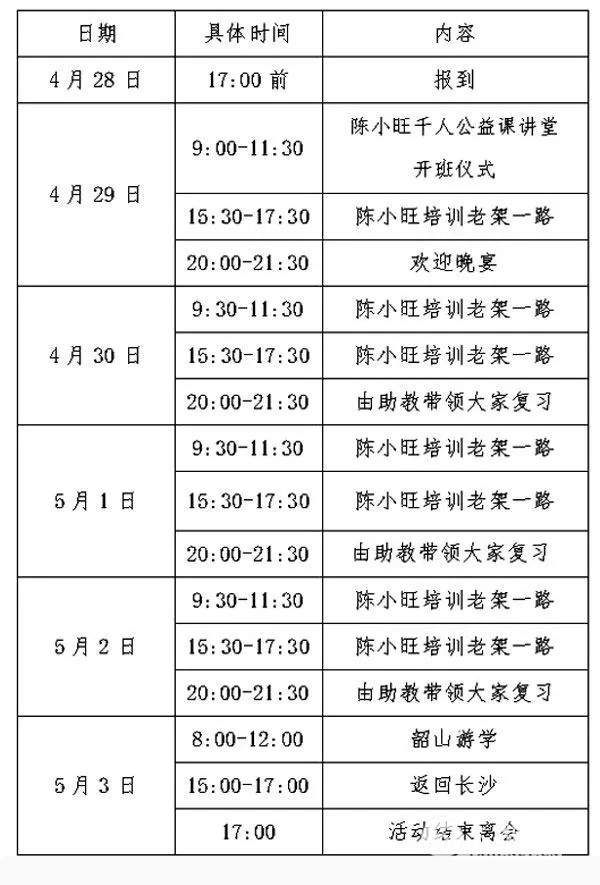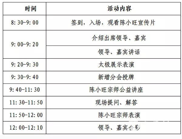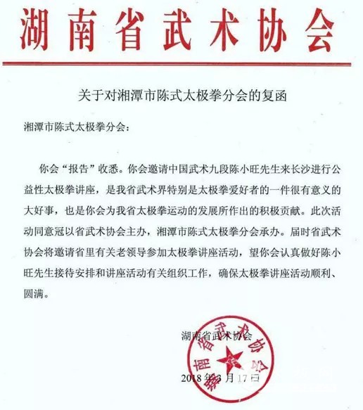 陈家沟陈氏第十九世太极拳掌门人陈小旺 陈小旺,中国武术九段;第七届全国人大代表;河南省第七届政协委员;陈氏第十九代太极拳掌门人;世界陈小旺太极拳总会会长;陈家沟陈氏太极拳协会名誉会长;原河南省武术馆副馆长;原河南省武术协会副主席;原河南省陈式太极拳协会主席;韩国圆光大学名誉教授;美国国际医药大学名誉教授;华侨大学客座教授,先生于1990年赴国外传承中国传统武术,积极响应祖国号召,成立《世界陈小旺太极拳总会》,巡回世界五大洲弘扬太极拳文化,倾毕生精力致力于太极拳文化的研究、传承与推广工作,三十年奔走世界各地,受众达三十余万人。2012年十月做客央视“文明之旅”栏目并荣获首届“中华之光——传播中华文化年度十大杰出人物”,2013年3月做客央视“华人世界”栏目,并荣获“第二届中华非物质文化遗产传承人薪传奖”。 2018年4月29日,由世界陈小旺太极拳总会、湖南省武术协会主办;世界陈小旺太极拳总会湖南湘潭分会、湖南省武术协会湘潭市陈式太极拳分会承办;快乐太极网、韶山市武术协会、邵阳市太极拳协会、湘潭市芊佑陈氏太极拳馆、湖南喜太极文化传播有限公司 、湖南省武术协会湘潭市陈式太极拳分会宁乡分会;岳阳县“月亮陈式太极拳推广中心”协办;湖南恒威体育文化交流有限公司运营;湖南省会电视台、相关官方网站、微信平台、杂志、湖南省会主要媒体报道的“健康中国 幸福长沙”陈小旺亲传之旅系列活动之长沙千人太极讲堂公益讲座拳友见面会将在长沙市岳麓区五强商务酒店一楼多功能厅展开。 入场券门票取票地址: 长沙市开福区体育馆路新奥大厦10楼1003 湖南恒威体育文化交流有限公司 谭老师 1354875080 健康中国 幸福长沙”陈小旺亲传之旅系列活动 活动内容: (一)陈小旺宗师见面会公益讲座 (二)"四海一家●心系太极”欢迎晚宴 (三)陈小旺太极宗师培训 (四)伟人故里韶山游学 (五)各分会会长带领团队汇报展演演示套路 (六)世界陈小旺太极拳总会新分会授牌仪式 (七)结业仪式 (八)陈小旺先生亲笔签发结业证书 (九)与陈小旺先生合影留念 图为陈小旺宗师为弟子夏伟湘捏架子 虚心使人进步,自满使人倒退。几乎所有高手名家都是拜师会友求学百家之长融汇而成,武林名谚云:谦受益、满招损!苦练十年不如名师一点。 陈小旺宗师老架一路及用法培训班 一、报名截止日期: 2018年4月20日,通过各分会报名的请于4月20日前将名单汇总至总会。 二、报到地点:湖南省长沙市岳麓区桐梓坡名典国际酒店 三、 报名方式:可通过手机或微信联系相关人员报名,如当地设有分会也可通过分会集体报名。 总会秘书处、湖南湘潭分会: 王鹏宇 联系电话及微信:17688839369 陶幸元 联系电话及微信:15197150588 夏伟湘 联系电话及微信:13875240660 四、参加培训人员条件: 1、太极拳爱好者 2、世界陈小旺太极拳总会会员 3、陈小旺先生名下各组织机构成员 4、无传染性疾病及精神病患者 5、能独立完成学习任务者 注:参加培训学员享有太极服一套、结业证书、一份活动期间的个人保险等福利。 五、食宿及伟人故里游学安排: (1)培训班学员可食宿自理; (2)可代为预定名典国际酒店房间,单、双间228元,行政单双间288元(含自助早餐),中餐、晚餐自理。 (3)培训班学员参加29日欢迎晚宴及韶山游学需交纳会务费350元。 六、培训费用详情咨询: 王鹏宇 联系电话及微信:17688839369 陶幸元 联系电话及微信:15197150588 夏伟湘 联系电话及微信:13875240660 七、培训地址:湖南师大附中博才实验中学 八、报到须知: 1、2018年4月28日报到; 2、报到时请携带本人有效身份证件及2寸蓝底免冠照片4张以供证书填写及存档所用; 3、长沙机场均有机场大巴直接到长沙市中心,可直接打的士到酒店; 4、长沙南站由地铁2号线直达长沙市岳麓区; 4、活动正值五一长假期间,请广大拳友提前规划好您的出行时间和返程时间提前购票; 5、本次活动食宿费用自理; 6、由于五一期间房量和房型有限,请提前预定,以缴费为准。 九、培训须知: 1.课前十分钟持培训证入场课间不得随意走动早退,保持课堂肃静; 2.上课期间通讯工具处于静音状态,培训期间未经允许请勿录像录音。 苦练十年不如名师一点 图为陈小旺宗师为弟子陶幸元捏架子 陈小旺宗师说过,练拳是在逐步缩小误差。正视误差,知道误差就能进步。缩小误差首先从调整外形开始,有了师父拳架的外形,再找师父捏架子,掌握缠丝功原理,明白运动规律,才能够自我纠正拳架,不断提高,练拳讲究方法,勤练积累,欲速不达。 有问必答,有错必纠,有惑必解 此次培训陈小旺宗师亲授陈式老架一路及实战用法,通过学习培训,使学员深入了解陈式太极拳动作招数的含义及实战用法从而达到举一反三的目的,使学员逐步了解太极拳每一招式的动作及要领,从而懂得练功的正确方法。培训课程上为大家详细讲解太极拳缠丝功、及丹田的三种运动方式、技击要领。 70多岁的陈小旺宗师温文儒雅,气宇轩昂,精神饱满,培训课期间孜孜不倦的反复带学员练习,逐一为众学员调整桩架,拳架。陈小旺宗师和蔼可亲,课堂上有问必答,有错必纠,有惑必解,曾让众学子无不感慨万分,并为先生的传道、授业、解惑与敬业之心折服。 4月28~5月3日行程表 4月29日欢迎晚宴时间表 5月3日韶山游学时间表 主办单位:世界陈小旺太极拳总会 湖南