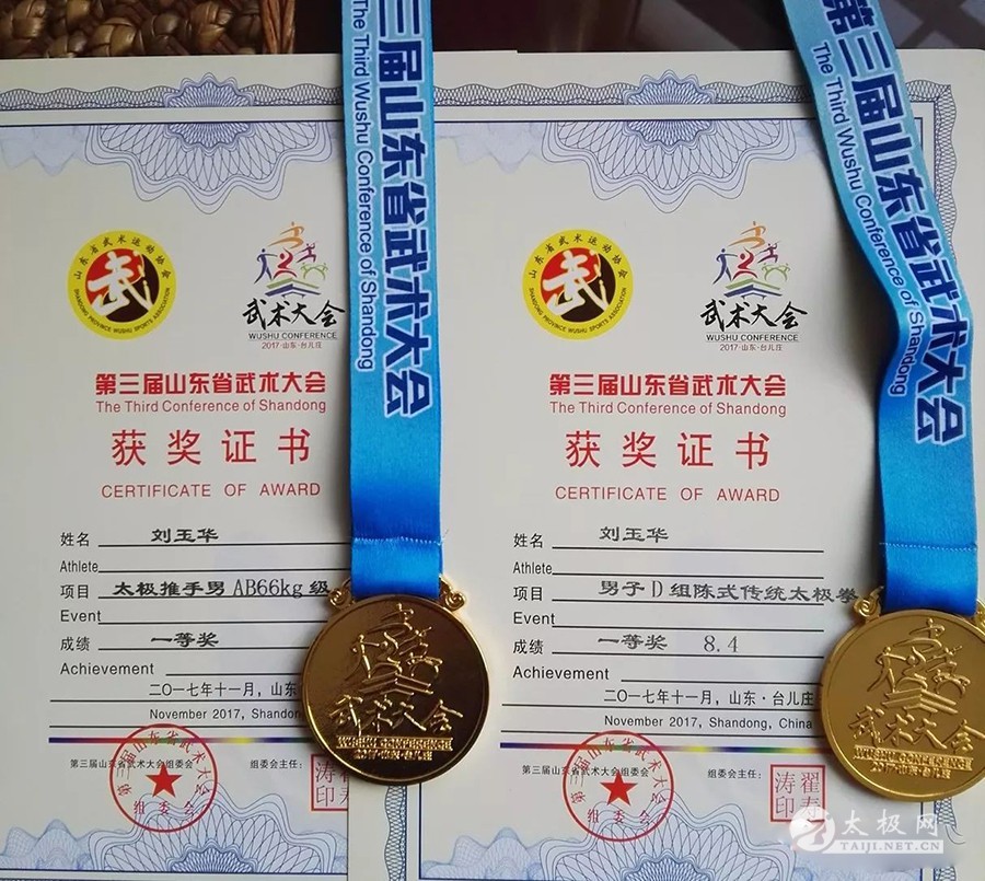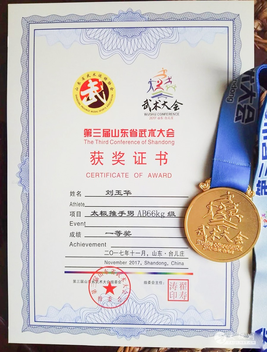 2017年第三届山东省武术大会在台儿庄古城再次掀起武术浪潮,此次武术大会由山东省武术协会主办,共设竞赛套路、竞技散打、传统套路、太极拳与器械、太极推手、功力、舞龙舞狮、武术操等共计60余单项比赛。届时80余支代表队、4000余名运动员聚集台儿庄古城,相互交流,切磋技艺,在武术之乡台儿庄刮起尚武之风。诸城市精武太极拳会馆代表潍坊武协参加2017年第三届山东省武术大会比赛取得优异成绩。 诸城市精武太极拳会馆代表潍坊武协参加2017年第三届山东省武术大会比赛取得优异成绩。 女子c组传统陈式太极拳一等奖刘炳慧 女子c组传统陈式太极剑一等奖刘炳慧 女子60公斤级太极推手冠军一等奖刘炳慧 奖金1500元 男子D组传统陈式太极拳一等奖刘玉华 男子D组传统陈式太极单刀三等奖刘玉华 男子AB组66公斤级太极推手冠军一等奖刘玉华 奖金1500元 男子C组传统陈式太极拳三等奖柏晓东 男子C组传统陈式太极单刀一等奖柏晓东 男子B组60公斤级太极推手二等奖刘培太 男子D组传统陈式太极拳三等奖刘培太 这次比赛取得好成绩离不开刘老师平时的专业培训与细心指导,刘老师常说:拳理和做人的道理是相通的。骄傲自满,你的功夫就会倒退。要知道,中国的武术,博大精深,没有人能说我学完了。活到老,学到老。天外有天,人外有人。刚刚学到点皮毛就自以为是,这就是你前进中的拌脚石,拳无止境。德行有了,功夫才能有,要靠你的品行,实力去赢得大众的口碑。刘老师经过多年系统的学习和苦练,已熟练掌握陈式太极拳各种套路和器械推手及各类养生功法,精通拳理和拳法,尤其擅长竞技等技术的研究和训练。勤于钻研,对太极拳推手、太极散手颇为谙熟,动作弹抖靠发、迅猛冷脆,功夫极具威力。在这次比赛中,刘玉华老师取得男子66公斤级太极推手冠军,在连续的多场推手比赛连续获胜,赛场上的他技法运用自如,发力刚猛冷脆,在太极推手中充分突出太极推手的实战特点。刘老师的实力实在让我们敬佩!所有的武术都离不开实战,只会练拳架而不会实战,那也只能算是锻炼身体、修身养性,必然会失去一部分意义。中国武术不是以进攻为根本目的,而是要用功夫来守住家园,传承我们的文化。 下面是刘老师在推手赛场上的精彩瞬间:
