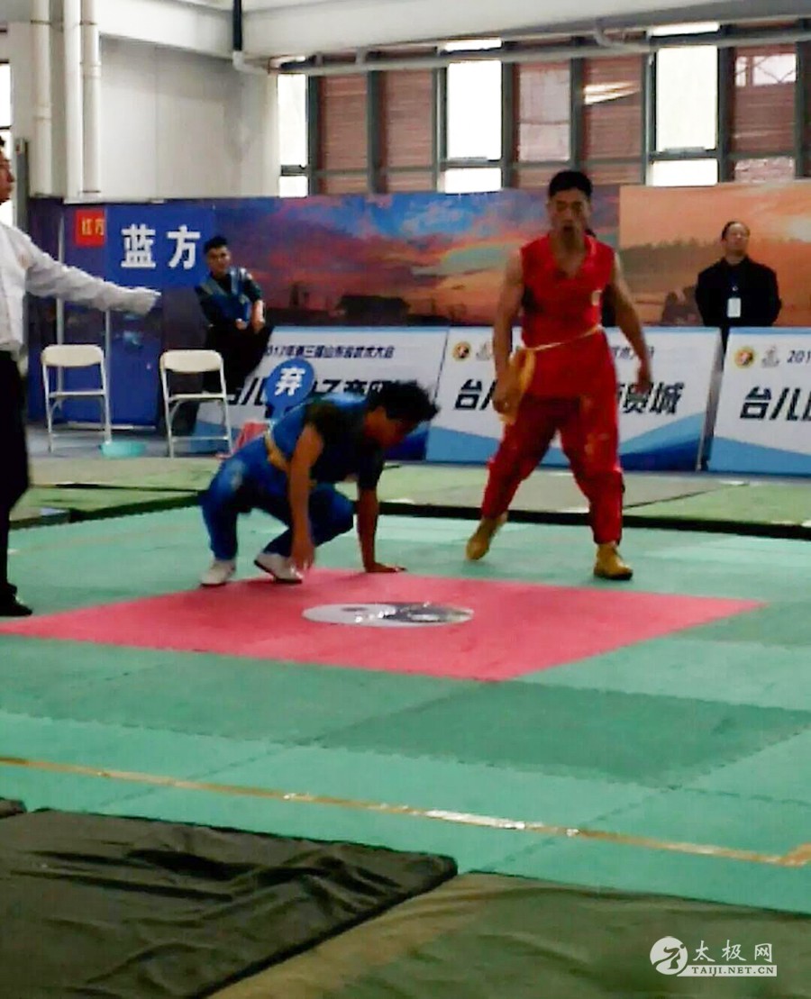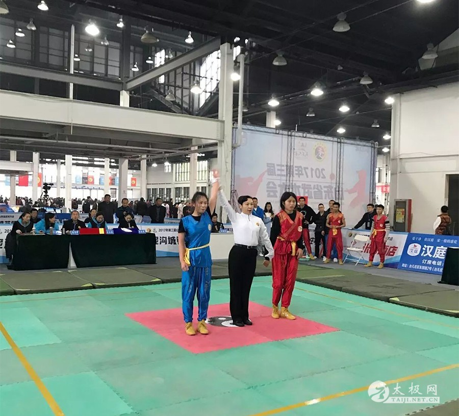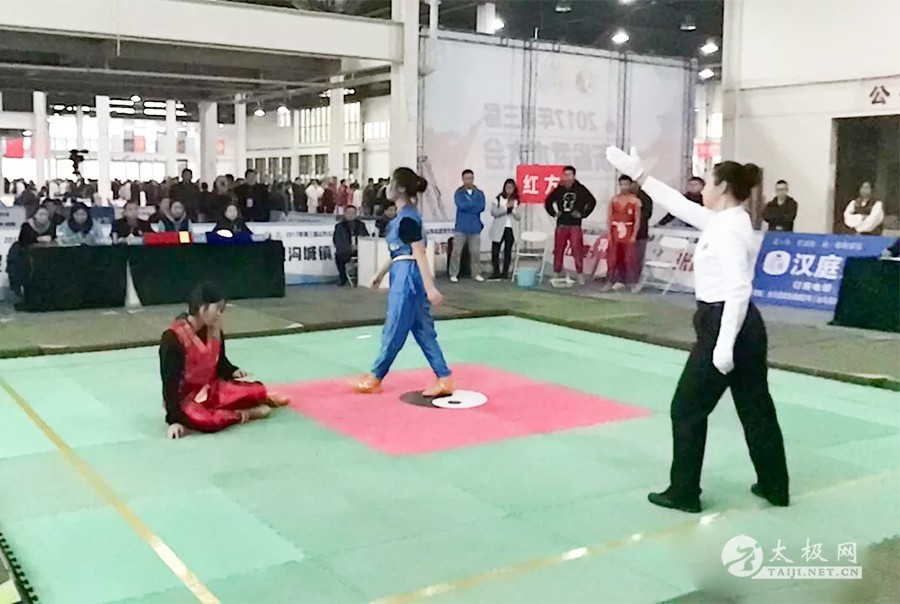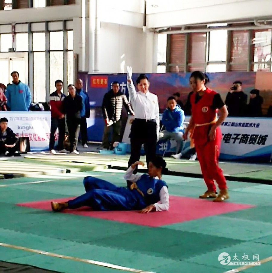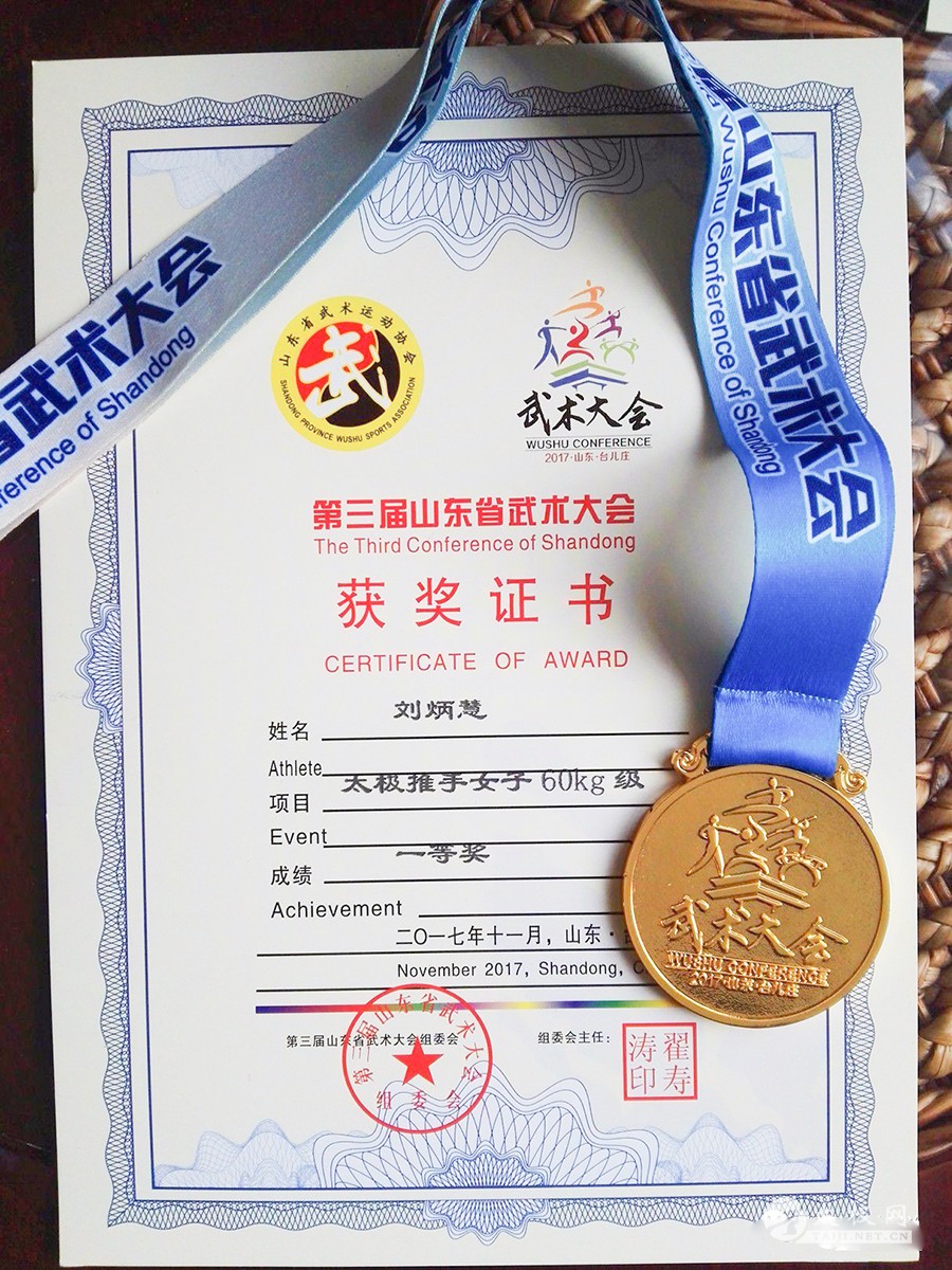 在女子太极推手中刘炳慧代表潍坊武协取得冠军,这离不开刘老师的专业培训和她自己平时的刻苦训练。可以看出她对武术的爱好与执着非一朝一夕。同时在套路比赛中她的太极剑风格优美潇洒,剑法清楚,形神兼备,精彩的表现得到评委裁判的欣赏和更多观众的赞赏。下面是她在推手赛场精彩瞬间: