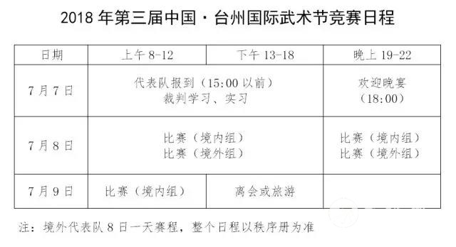 时间地点: 2018年7月7日至9日中国浙江省台州市 日程安排: 三大赛事活动: 第三届国际传统武术大赛(套路比赛) ˜(1)武术拳法、械法套路比赛(包括各拳种、各流派的拳术、器械的单练、双人练、多人练、对打、集体项目和团体综艺表演等)。 (2)套路个人全能王中王大奖赛(包括个人全能赛、网络全能王中王候选人推荐赛)。 (3)武搏对抗展示项目(包括散打、推手、推马、短兵对打、长兵对打等,以及咏春自由搏击、咏春黐手、中国跤及世界各国的跆拳道、空手道、柔道、中国短兵、中国长兵、剑道、杖道等非实战的对抗性搏击展示)。 (4)木兰拳系列(包括;木兰拳、剑、扇规定套路,自选木兰以及抒怀、武韵、韵律等新拳系列)。 (5)集体健身气功、健身功法(五禽戏、六字诀、易筋经、八段锦、十二段锦、马王堆导引术、导引养生功十二法、大舞、太极养生杖等竞技功法以及普及功法、养身舞、养身功法、太极导引功、健身操、健身球、健身排舞类、太极柔力球等)。 第二届国际青少年大众散打王大奖赛 (实战比赛)。 第二届武术非物质文化遗产项目展示评奖赛 (已被确认的国家级、省级、市级、县区级武术非物质文化遗产项目和准备申报中项目)。 注:比赛项目号下载(长按识别下面二维码) 两项考试、认证活动: ˜※ 中国武术段位海外考试(港澳台地区、海外及境内外籍人士,文件另发)。 ˜※ 蓝盾防卫技术等级认证考试。 参加办法: (一)各国家、港澳台地区武术协会、功夫团体、健身气功组织、健身俱乐部、武术社团、老年体协、青少年活动中心、武术馆校、大专院校、中小学、幼儿园、厂矿企业、机关事业单位、街道、社区和村镇及武术爱好者均可组队参赛。 (二)参赛队可报领队或教练1至2人,随队人员(含管理员、队医、观摩旅游)若干人,运动员人数不限,男女不限。各代表队参赛运动员达15人以上的团队可报具有武术套路、散打裁判资格的随队裁判1人。 (三)参赛选手达4人及以上为团队参赛,不足4人的代表队和个人视为个体参赛。 (四)每位选手限报单练4项、其它各类各1项(包括多人练、对打、武搏展示、大众散打、徒手集体项目、器械集体项目、团体综艺表演项目、武术非物质文化遗产展示项目)。各类不允许超报。 (五)对打项目限三人以内,不设陪练。 (六)集体项目须报6人(含)以上; (七)团体综艺表演项目须报16人(含)以上。 (八)武术非物质文化遗产展示评奖赛可报个人、多人(2至5人)和集体展示(6人及以上)。 (九)个人全能单练项目不得少于3项(含拳、械)。 (十)选手达20人及以上的代表队可推荐1名“全能王中王”争夺赛的网上候选人。“全能王中王候选人”男女各5名,由6月26日至7月5日24点为期10天在微信公众号《研武功坊》网上的投票产生。 (十一)青少年大众散打王赛限A组和B组选手报名参加,各队参赛人数不限、男女不限、同一重量级别人数不限,详见《青少年大众散打赛竞赛规程》。 (十二)各队均可申报开幕式表演评奖项目。 (十三)大赛设“发展武术运动贡献奖”,对宣传、组织达30人、50人、80人和120人以上选手参加本届大赛有特殊贡献的组织或个人进行表彰,评出三等奖、二等奖、一等奖和特等奖,颁发奖金、奖杯和证书。 (十四)设男、女武坛金童奖、武坛耆英奖,奖励参赛年龄最小和年龄最大的选手。 (十五)设大赛荣誉奖,评出最佳运动队、最佳领队、最佳教练员、最佳运动员、最佳裁判员等奖项。 (十六)海外代表队可参加中国武术段位海外考试,详见海外考试规程。 (十七)大赛依据浙江蓝盾危急防卫技术中心关于《<浙江“蓝盾防卫”星级资格认证>管理办法》有关规定,设置以本次竞赛成绩作为确认“蓝盾防卫”的星级资格和功夫之星的认证及资格晋升的考试。凡参加本届比赛选手均可报名参与防卫技术资格认证,报名时须在“蓝盾防卫资格认定”栏目中打勾确认。 竞赛办法: ① 本次比赛为武术、武搏展示单项赛、集体项目赛、个人全能及全能王中王大奖赛、团体武术综艺表演大奖赛,青少年大众散打个人赛、散打级别王大奖赛和总团体大奖赛。 ② 竞赛规则采用国家体育总局武术运动管理中心2012年印发的《传统武术竞赛规则》、《武术散打竞赛规则》和本规程、分规程的有关补充规定。 ③ 中国武术段位考试采用最新《中国武术段位制》条例相关规定。 ④ 蓝盾防卫技术等级资格认定采用《“蓝盾防卫”技术考试成绩晋升标准》。 年龄组别: 个人全能、全能王中王、少儿大众散打王、境外选手单项和集体项目竞赛年龄分组: 儿童组(A组):12岁以下(2007年1月1日之后出生者); 少年组(B组):12岁至17岁(2001年1月1日至2006年12月31日); 青年组(C组):18岁至39岁(1979年1月1日至2000年12月31日); 中年组(D组):40岁至59岁(1959年1月1日至1978年12月31日); 老年组(E组):60岁和60岁以上(1958年12月31日之前出生者)。 ˜境内单项、集体项目竞赛年龄小组分组: ˜(1)儿童分组(A组): A1组: 6岁以下(2013年1月1日以后出生) A2组: 6岁 (2012年出生) A3组: 7岁 (2011年出生) A4组: 8岁 (2010年出生) A5组: 9岁 (2009年出生) A6组: 10岁(2008年出生) A7组: 11岁(2007年出生) (2)少年分组(B组): B1组: 12岁(2006年出生) B2组: 13岁(2005年出生) B3组: 14岁(2004年出生) B4组: 15岁(2003年出生) B5组: 16岁(2002年出生) B6组: 17岁(2001年出生) (3)青年分组(C组): C1组: 18~24岁(1994年至2000年间出生) C2