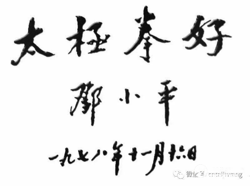 2邓小平主席的题词,老一辈党和国家领导人的身体力行,鼓舞了太极拳的国际化发展。 1978年11月,由日本众议院副院长三宅正一任团长的日本国会议员代表团来华访问。当时小平同志任国务院副总理。11月15日,在时任中日友好协会会长廖承志等的陪同下,邓小平同志会见日本嘉宾。交谈中,三宅正一团长谈到他正在学习中国太极拳,小平同志兴趣盎然地介绍了太极拳运动的优点,三宅正一深感小平对太极拳有很深的见解,遂请求小平同志为广大的日本太极拳爱好者题词,以作纪念。小平同志欣然答应。几日后,便将一幅墨宝“太极拳好”派专人送交已赴杭州访问的三宅正一团长。