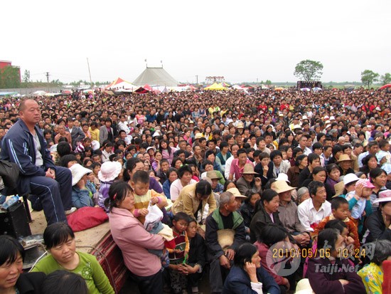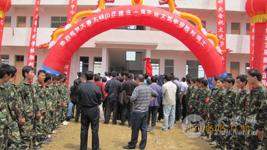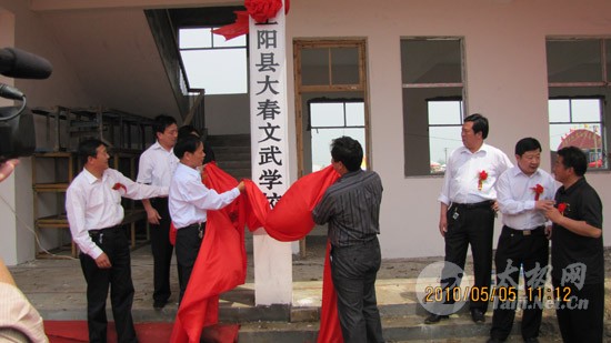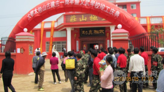庆典仪式主会场 太极山庄广场上观看节目的人 2010年5月5日,河南省驻马店市正阳县单楼村又是人山人海。大春太极山庄建庄一周年暨二期工程文武学校竣工庆典活动,今日在这里举行。单楼村是太极山庄的创办人¬¬太极拳大师王大春的故乡。 2009年5月,在县领导的关心和支持下,在各地朋友和乡亲们的帮助下,王大春筹集资金,在家乡完成了太极山庄一期工程的建设任务。使得以太极拳为主要内容的太极养生院在昔日偏僻的乡村拔地而起,成了当地乡村建设的一大亮点。庆贺竣工那天,平日满算2000多口人的村庄,吸引了前来观看的4万多名群众。王大春建设太极山庄,主要目的是:在家乡进一步以弘扬太极拳文化为载体,实现太极拳养生健身、休闲旅游和特色农业项目的结合,推动当地精神文明建设和经济的发展,以实际行动回报家乡,为家乡群众的致富摸索经验探路子。 一年来,以山庄为依托,他们成立了有县四大班子领导任顾问的正阳县陈式太极拳协会,以出版有关刊物、举办辅导员培训班、派出教练到各单位进行辅导等方式,配合各单位,在全县广泛开展了太极拳的普及活动,并组队参加了国家体育总局举行的国际太极拳邀请赛,组织了全县太极拳的交流活动,使中华民族的国粹太极拳,在正阳得到了如火如荼的发展。与此同时,他们按照规划,着力进行了山庄二期工程的建设,建庄一周年时,完成了山庄人工湖河的挖掘整治和山庄的综合教育基地——大春文武学校的基本建设任务。 为庆贺建庄一周年和二期工程的竣工,今日,他们举行了隆重的庆典仪式。前来参加仪式的有:正阳县县委常委 、统战部长牛清泉、副县长刘一修、人大副主任车顺才 、政协副主席王建军以及县直有关单位的负责人。全国17个省市的28个太极拳组织和有关团体,向庆典活动表示祝贺。彩门横跨,贺幅傲风,人山人海,又是一年人气旺。大家以赞许的目光打量着王大春和他的工程。围绕庆典活动,自5月1日到7日,是太极山庄的文化集会,七八个文艺团体、300多个商户,使山庄异常沸腾。 王大春打算,在进行二期工程配套的同时,下步将尽快启动文武学校运行的有关工作,抓紧进行三期工程的建设。到明年上半年,建起能容纳1500人左右的体育馆,将每年5月1日至7日,升办为太极山庄太极拳文化节,并使之成为正阳县固定的、文化商贸相互映辉的节会。使山庄尽快地实现养生健身、文武学习、旅游度假、节会比赛、餐饮休闲综合功能的运行。  山庄人工湖一角  山庄门前  王大春在庆典仪式上  县领导出席庆典仪式  县领导视察工地  县领导为文武学校揭牌  在山庄赶集的人群 在山庄养生院练拳