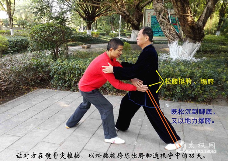 守桩是推手的学前对练功课,以此对练熟习“下有落地生根”之法与“上有不倒翁”之术,体现“上虚下实中间活”的技术要求,练出我守我疆、以静待动的守桩功夫。相传在武术界享有盛名的太极拳宗师陈长兴,被称为“牌位大王”,意思就是平日练拳姿势端正,久而久之,不管走路还是站立,都立身中正。他无论是在看戏还是赶会,站立千万人中,任凭众人如何拥挤,他脚步丝毫不动。如果有了守桩功夫,就能在推手中增强“舍己从人”和“引进落空”的信心,就会提高推手的技术水平。守桩练法被不少的民间拳师视为门内秘传的功课,只传授给徒弟,不公开教门外之学生,正是所谓“内外有别”的练功习拳。我的恩师林墨根是较为重视站桩单练与守桩对练之训练功课的。 守桩训练分为定步守桩和活步守桩,定步守桩是初级阶段的入门练法,在此介绍一种弓步定步守桩的练法。如图1所示,守桩时,以垂直的松沉劲为主,前腿松腰落胯,后腿松腰塌胯,松开的落胯、塌胯把腰腹部都掉入了两腿之间,腰胯部分的肌肉不用力了,就有了重力自然下沉的动态之势,如能气沉丹田则更好。前脚根劲相对为虚,后脚根劲相对为实。以斜向的支撑力为辅,意念后脚借助地面反座力一撑胯二撑脊背,同时前脚意念借助地面反座力一撑胯二撑胸膛,也是前脚撑力相对为虚,后脚撑力相对为实。虚领顶劲的同时胸掤微挺接劲。 为了把弓步定步守桩尽快练到位,可按以下图示分解的更细练法去学练。我的“二大爷”老师说过:“传统太极拳功夫是来源于细节练法的积累”,实践经验证明确实如此。图2所示是让对方用手在后腿髋骨尖喂劲推按,以裹裆、松腰挺胯练出胯脚通根守中的功夫。裹裆是为了实腿更有力,腰胯既松沉到脚底,要有俗称的“下沉劲”,松沉到脚底是太极拳初学者追求松沉的第一个目标;又以地面反座力撑胯,要有俗称的“上传劲”,这是太极拳初学者追求松沉的第二个目标。注意体悟的是:挺胯不宜横力前挺,而是要在塌胯的沉势中挺,还要是恰到好处的挺胯,挺少了功效不够,挺多了可能失重,挺合适了就是守中的内涵技术。 图3所示的是让对方手掐前腿腹股沟处喂劲推按,以松腰落胯练出胯脚通根守中的功夫。腰胯既松沉到脚底,又以地面反座力撑胯。注意体悟的是:落胯不宜硬顶对方的推按力,而是要把胯松开成为口吞之势,既能柔性的吞下对方的推按力,又能沉稳的长腿力生脚根。练功习拳的实践告诉我们:拳势下盘的桩架单有脚下生根还不够,还得腿膝够有力才好,先贤所说的腰腿功夫是含腰、胯、腿、膝、脚的松沉功夫。 图4所示的是让对方一手掐前腿腹股沟处喂劲推按、另一手在后腿髋骨尖喂劲推按,以松腰落胯、塌胯、挺胯、合胯练出协调沉胯通根守中的功夫。在此着重说一下合胯,就是把前腿落胯、后腿塌胯与裹裆挺胯整合一起,合胯之“合”的真义在于顺着松沉之势合住劲,合不了劲的是假合胯,“二大爷”老师指明:“太极拳的好东西在内不在外”,所以协调、平衡能力功不可没。 图5所示的是让对方喂劲手扒肩背,以松腰沉胯撑脊练出脊脚通根守中的功夫。既要腰胯松沉到脚底,又以地面反座力一撑胯二撑脊。这里的沉胯是指前腿落胯和后腿塌胯,前脚吃劲大约七成就相对为实,后脚吃劲大约三成就相对为虚。撑胯撑脊都是一种以意念引导贯通的支撑劲力,是下、上两点的支撑劲路。这个练法对于训练前腿脚的沉劲、撑力都有明显的功效。 图6所示的是让对方用手喂劲推按胸膛,以折叠劲练出胸脚通根守中的功夫。既要腰胯松沉到脚底,又要借助地面反座力用后脚一撑胯二撑脊和用前脚一撑胯二胸。所谓“折叠劲”就是有向前往上撑的劲力又有向后往上撑的劲力,相合对应,使“沉中撑”稳而能中定。守桩时,要虚领顶劲的同时胸掤微挺接劲。胸掤是内在掤劲显现的感觉,微挺是脚撑脊背而带动胸膛外在姿势的变化动作,要尽量追求内外相合。初学对练守桩时,较难练出恰到好处的接劲功夫,需要一段时间的训练才能把接劲练上身,初练不久的守桩接劲有点顶有点丢是正常的过渡性阶段,只要意识到下功夫去磨合调整为“不顶不丢”的状态就行了。当然,学生如得到老师言传身教其练法与要领的话,那是最好了,省心又少走弯路。 以上所述都是打基础的初级练法,是身势几乎不变、只接劲、收劲于脚而化劲层次较低的守桩,老练家俗称为“推不动”的守桩功。待上下贯通有根了,能较好的接劲了,身上练出了守桩的一些中定功夫,下一步进阶学练的是边沉边转、边接边化之守桩功课了,身势会随着虚实而有所变化,一边接劲一边化劲的层次相对较高,较大程度上体现了 “上虚下实中间活”,老练家俗称为“推不着”的守桩功。 本站编辑:太极网安安 |