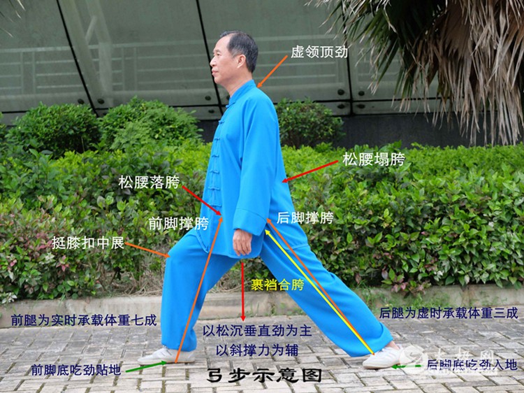 弓步之进阶练法是与初级入门练法相比而言的,具有较高层次的技术要求,还有以下特点: 一是以开胯圆裆形成弓步,自然使松沉的内气和劲力走阴面,就是沿着腰、胯、裆、膝腘、小腿骨沉到脚底,能较为有效的控制膝盖弓过而异常吃劲受力,避免了因拳病造成膝盖伤痛。 二是以裹裆来增强腿、膝、脚的劲力。 三是以脚掌内侧吃劲于地来促进脚与膝、胯、腰的贯通功效,亦俗称脚腰通根劲。 练功习拳时弓步实腿之膝如前弓过了,就会因膝盖异常吃劲受力而僵滞紧硬,有部分太极拳爱好者不明拳理,不晓拳法,练的弓步拳势是内气和劲力都是走阳面,沿膝盖沉到脚底。对于拳势下盘而言,内气劲力走阳面的功效确实不如走阴面那么好。我的一些弟子和面授学生明此拳理,亦晓此拳法,但练的拳势弓步不能自觉控制膝盖前弓在合适的位置,需要眼的余光看一下,着意的调整膝盖前弓多少,这样是不能自觉使内气和劲力都是走阴面,其实主要原因是还不会真的松腰、松胯、松膝站弓步。 弓步的进阶练法如下所述: 一、两腿伸直的大步身正站立,两脚横向宽距视身高腿长而定,大约20—30厘米。 二、两腿胯根(腹股沟处)对拉松开,前腿裆部圆张松开。注意的是:尽量不让前腿胯根往前移动,力求前腿之胯准确定位。所谓定位,就是最后形成弓步的架势时,前腿胯根垂直于地面点就是初始站立姿势时前腿胯根垂直于地面的那个点。 三、前腿之胯根的松开和裆的圆张将尽时,就是不好再松再张下去了的时候,松腰落胯的垂直下沉,自动使小腿骨大体垂直于地面,不用刻意调整膝盖弓出多少。 四、后腿在松腰塌胯的状态下伸直,同时要恰到好处的裹裆,如果实在是不能自然伸直腿,那么让后腿自然形成弓腿稍弯,但不宜跪膝弯腿。 五、为了有利于合胯(合胯的意思是把前腿落胯、后腿塌胯的沉劲合住),前脚内碾一点,膝也自然内扣(扣要含展劲)一点,前脚、后脚的脚内侧都要尽量吃劲于地,但脚外侧不能因此掀起。 六、前实脚承重大约七成,后虚脚承重大约三成。脚底的承重是这样的:脚跟占大约七成,脚掌占大约三成。 本站编辑:太极网安安 |