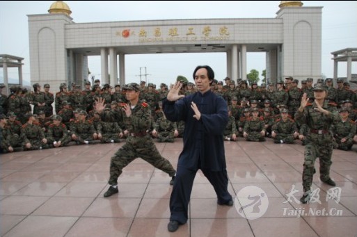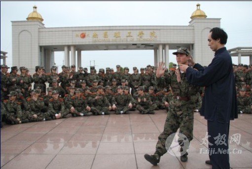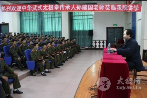 2010年4月22至5月1日南昌《航天》理工学院特邀中华武式太极拳传承人孙建国老师莅临学院讲学。经校务处研究决定聘孙老师为本院客座教授,由南昌《航天》理工学院法人代表邱小林院长亲自颁发证书。为期近十天的讲学和考察活动圆满结束,讲学期间赢得了全体南昌理工学院军训教官及师生热烈欢迎及赞扬,收到非常满意的效果。 孙老师于4月23日在南昌理工学院英雄校区二楼会议厅就如何使太极拳文化与校园文化有机结合事宜进行研讨。参加研讨会的有院校学工处处长黄学光,院校行政办公室主任赵波,院校军训部副部长肖远仁,太阳能光电学院副院长邓朝宏,院校宣传科科长王瑞等。作重从以下个方面进行:第一,演讲太极文化及武术与大学文化有机结合使学员德、智、体、武全面发展并积极响应国家教学大纲号召。第二、演讲传统武氏太极拳的渊源及特点。传统武氏太极拳为文人所创,文人所传,文人所练的太极拳,将太极拳文化与校园文化有机结合,打造(航天)南昌理工学院独具特色的一流高等院校。第三,在院校大体育舘向全体军训教官亲身演练武式太极一路中捋架,太极二路炮捶部分套路。 讲学结束前,孙老师在(航天)南昌理工学院大门口亲自传授军训学员部分太极拳动作招式及身法要领,让学员在掌握一些太极拳要领同时感受太极身法的内含。大家都热情高涨认真学习收到很好的效果,学员们希望以后能有更多机会学到更多的太极文化真谛。 院校宣传部积极配合拍摄录像和合影留念