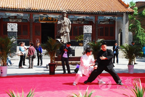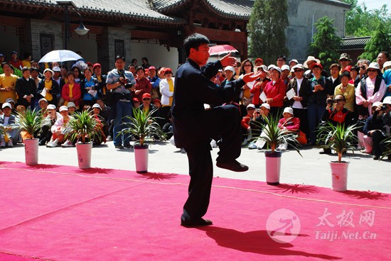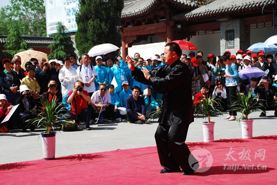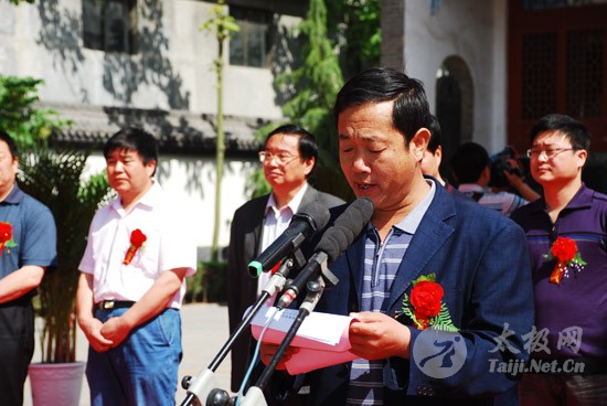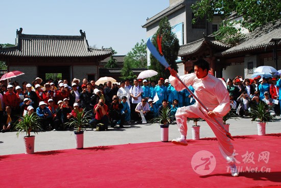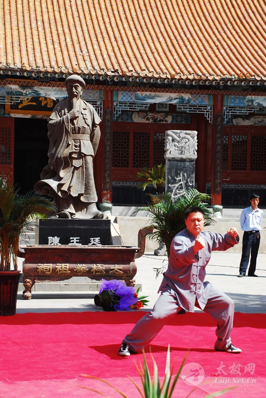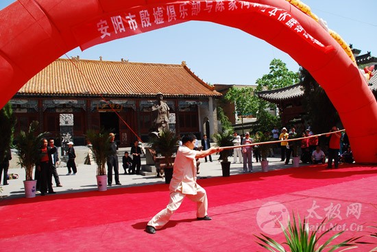 2010年5月11日上午,古都安阳300余名太极拳爱好者,在殷都太极拳俱乐部理事长史晓明、秘书长陈汉菊女士和安阳市体育局有关领导的带领下,来到太极拳发源地陈家沟寻根问祖、交流拳艺,共同举办“陈家沟——安阳市太极文化联谊会”活动。 在欢迎仪式上,温县人民政府副县长李永生、陈家沟村委主任兼太极拳推广中心秘书长陈皂罗和殷都太极拳俱乐部理事长史晓明分别发表了热情洋溢的讲话。安阳太极拳爱好者向太极拳始祖陈王廷铜像敬献了花篮。陈家沟太极拳名家陈照森、陈冲、陈炳、陈二虎、陈三虎和部分武校的学员分别为安阳的太极拳爱好者进行了太极拳套路、器械、推手等表演,赢得大家阵阵掌声。 安阳太极拳爱好者兴致勃勃的参观了太极拳祖祠和中国太极拳博物馆,并和参加表演的大师们合影留念。 古都安阳和太极拳发源地陈家沟有着很深的历史渊源。古都安阳有着悠久的历史文化底蕴,殷商之都、甲骨文、周武王羑里城演周易八卦等形成了特有的殷墟文化、周易文化、太极文化起源;陈家沟第九世陈王廷集众家武术之长,根据阴阳开合之理、道家导引吐纳之术、理根太极创编了太极拳,经过陈家沟数代人的努力,太极拳逐渐风靡全世界,成为当今人们最佳健身运动项目之一和追求和谐的文化典范。在第十个“世界太极健身月”期间,两地举办这样的活动将进一步加深双方的感情和友谊,推动太极文化的发展。 早在2006年,陈家沟太极拳推广中心、陈家沟村委就和安阳殷墟太极拳俱乐部结下了良好的友谊,两地不断举行各种文化互访活动,收到良好效果。  向陈王廷铜像敬献花篮 陈王廷铜像 [page] 陈家沟村委主任、太极拳推广中心秘书长陈皂罗 殷都太极拳俱乐部理事长史晓明 温县人民政府副县长李永生 [page] 安阳太极拳爱好者 欢迎仪式现场 殷都太极拳俱乐部秘书长陈汉菊 [page] 陈冲演练的陈式太极拳小架 陈超表演的春秋大刀 陈二虎表演的陈式太极拳老架二路 [page] 陈三虎演示的太极推手 陈炳 陈炳 [page] 陈照森 太极大杆 两地太极拳爱好者合影 和陈照森大师合影 参观太极拳祖祠 在中国太极拳博物馆传承谱系触摸屏前