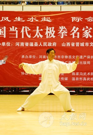 | “观众朋友,今晚的山西省晋城市文体宫成了太极拳的海洋,风生水起 际会太行2010中国当代太极拳名家晋城演武大会正在这里激情上演。” 县委常委、常务副县长樊振义,副县长霍晓丽与晋城市政协副主席陈改玲一起现场观看演武大会。 副县长霍晓丽在开幕式上讲话。霍晓丽指出,这次演武大会,不仅是晋城和温县两地太极拳界的盛事,也为两地的太极拳爱好者搭建了一个沟通的平台,对于今后进一步开发、保护、弘扬好太极拳这一优秀民族文化遗产,做强、做大太极拳文化产业提供了一个新的思路。 演武大会由温县人民政府和山西省晋城市文化广电新闻出版局联合主办。大会云集了国内众多太极拳流派和各路太极拳大师,高手同台,分外精彩,为广大观众献上了一场太极拳的饕餮盛宴。 演武大会上,名家荟萃,刀光剑影,各式表演快似流星闪电势不可挡,缓如涓涓细流绵里藏针,真正体现了中华太极功夫的博大精深和源远流长。在现场,一路看下来,除了赞叹高手精湛武艺的同时,一些特别的表演给我们留下了深刻的印象。 曾先后七次参加河南卫视武林风擂台比赛,人称“拼命三郎”的李虎,带来了当晚最惊险的表演------单肘开砖。三块厚实的砖头并排放在一起,只见李虎稍稍用力,“咔嚓”一声,三块砖齐声折断,李虎的胳膊肘却毫发无伤,现场观众报以热烈的掌声。 最抢眼的表演则来自温县陈家沟王占军表演的“丹田弹抖”。丹田弹抖是太极内气功的一种具体展现形式。王战军在太极功夫的修炼过程中,以极强的悟性和刻苦精神,精通了太极拳内气功丹田弹抖。他仅以丹田之气,就用肚皮弹起几公斤重的铁块,观众在意外之余真正领略了太极拳的出神入化。 陈家沟是太极拳的发源地,晋城,又是陈家沟陈氏始迁祖陈卜的故土所在。相传,陈卜离开山西前往河南时,身具武功,功夫十分了得。如今,陈卜子孙以武扬名。作为陈卜故乡人的后代,晋城武林中人功夫又是如何呢?当晚最出彩的温县晋城两地的太极推手擂台赛给出了答案。激烈的推手对决中,不时有选手被对手抛出数米之外,充分展现太极拳四两拨千斤、小力胜大力的特点。整场擂台赛气氛相当热烈,台下观众的呐喊声与台上太极功夫高手的表演遥相呼应,将擂台赛一次次推向高潮。 太极拳名家表演在当晚也是呼声最高的节目之一。王西安、陈桂珍、朱老虎等知名太极拳大师一一登台献艺,一招一式中,着实让观众领略了太极拳的刚柔并济、虚实变幻和动静相合。 温县太极高手的精彩表演征服了晋城的很多观众,而晋城的太极高手自然也不甘示弱。无论是集体套路表演,还是单人演示,都充分显示了晋城太极功夫高手的高超技艺。 演武大会为晋城、温县两地的太极高手提供了一个同台技艺、切磋交流的平台,广大观众也在两地高手的精彩对决中再次领略了太极拳的无限魅力。 【同期声】 腾挪太极拳传承人 刘盘 “这次来山西表演,给我们太极拳是一个很好的机会,是一个平台,希望更多的人通过这次表演,进一步了解腾挪太极拳。” -------- 【现场播报】 记者 魏满娇 “观众朋友,今晚的山西省晋城市文体宫成了太极拳的海洋,风生水起 际会太行2010中国当代太极拳名家晋城演武大会正在这里激情上演。” 县委常委、常务副县长樊振义,副县长霍晓丽与晋城市政协副主席陈改玲一起现场观看演武大会。 副县长霍晓丽在开幕式上讲话。霍晓丽指出,这次演武大会,不仅是晋城和温县两地太极拳界的盛事,也为两地的太极拳爱好者搭建了一个沟通的平台,对于今后进一步开发、保护、弘扬好太极拳这一优秀民族文化遗产,做强、做大太极拳文化产业提供了一个新的思路。 演武大会由温县人民政府和山西省晋城市文化广电新闻出版局联合主办。大会云集了国内众多太极拳流派和各路太极拳大师,高手同台,分外精彩,为广大观众献上了一场太极拳的饕餮盛宴。 演武大会上,名家荟萃,刀光剑影,各式表演快似流星闪电势不可挡,缓如涓涓细流绵里藏针,真正体现了中华太极功夫的博大精深和源远流长。在现场,一路看下来,除了赞叹高手精湛武艺的同时,一些特别的表演给我们留下了深刻的印象。 曾先后七次参加河南卫视武林风擂台比赛,人称“拼命三郎”的李虎,带来了当晚最惊险的表演------单肘开砖。三块厚实的砖头并排放在一起,只见李虎稍稍用力,“咔嚓”一声,三块砖齐声折断,李虎的胳膊肘却毫发无伤,现场观众报以热烈的掌声。 最抢眼的表演则来自温县陈家沟王占军表演的“丹田弹抖”。丹田弹抖是太极内气功的一种具体展现形式。王战军在太极功夫的修炼过程中,以极强的悟性和刻苦精神,精通了太极拳内气功丹田弹抖。他仅以丹田之气,就用肚皮弹起几公斤重的铁块,观众在意外之余真正领略了太极拳的出神入化。 陈家沟是太极拳的发源地,晋城,又是陈家沟陈氏始迁祖陈卜的故土所在。相传,陈卜离开山西前往河南时,身具武功,功夫十分了得。如今,陈卜子孙以武扬名。作为陈卜故乡人的后代,晋城武林中人功夫又是如何呢?当晚最出彩的温县晋城两地的太极推手擂台赛给出了答案。激烈的推手对决中,不时有选手被对手抛出数米之外,充分展现太极拳四两拨千斤、小力胜大力的特点。整场擂台赛气氛相当热烈,台下观众的呐喊声与台上太极功夫高手的表演遥相呼应,将擂台赛一次次推向高潮