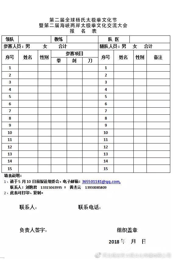 第二届全球杨氏太极拳文化节暨第二届海峡两岸太极拳文化交流大会 一、大会组织 1、主办单位 邯郸市体育局 河北杨志芳太极文化传播有限公司 2、承办单位 邯郸市杨氏太极拳运动委员会 爱太极(北京)国际发展有限公司 台湾杨家老架太极总会 国际杨氏太极拳协会 西安杨式太极拳研究会 世界永年太极拳联盟 山西省杨式太极拳研究会 太极疗(中国)文化发展有限公司 3、协办单位 邯郸市电视台 中原商报 太极杂志社 武安视窗 河北硅谷公司 河北太极酒业 二、时间及报到地点 1、时间:2018年5月26日 2、报到地点:邯郸金瑞商务酒店报到 三、活动地点及交通方式 1、活动地点:邯郸市邯钢体育馆 永年区 古武当山(中华大街与农林路交叉口西行200米路南。火车站南行与农林路交叉口东行300米) 2、交通方式:邯郸火车站向南步行150米路东,高铁乘36路车至和平路浴新街口下车南行300米路东。 3、酒店电话:0310——7645678 四、主要日程 1、5月27日 8:00——10:00 开幕式 10:00——12:00 各地各队杨式太极拳、剑、刀交流展示。每队6-12人,仅限集体。上场时间,太极拳4-5分钟,器械2-3分钟(需配音乐MP3格式) 设金、银两项奖项,奖牌证书按实际上场人数颁发。 12:00——13:00 午餐 13点—18点 同上午10点以后内容。 14:00——18:00 杨式太极拳理论峰会在邯钢体育馆会议厅举行。 2、5月28日 上午 地点:永年广府 祭祖:早7点乘车到杨氏陵园祭奠杨家列祖列宗。 集体合影:9点30分在广府国际太极文化交流中心集体合影留念。 12点午餐,餐后与会人员可凭会务证在广府老城各景点免费旅游。 下午——29日 古武当山旅游,自愿参加。 乘车时间16点,于广府太极文化交流中心门前集合。 五、会议经费 1、所有参会人员会务费100元,包括午餐、去广府的乘车费用。 2、参加交流展示的每人会务费增加100元(可报三项)。 3、参加古城武当山旅游的每人会务费增加160元,包括来回乘车、午餐、古武当山门票(包括索道票)。 六、接待组电话 王守义:13230037159 常克力:18031002039 协助需要者联系住宿和接站 七、会务组电话: 檀训亭:13931065953 岳东合:13403104933 八、特别申明 本次文化节,也是杨振国宗师逝世五周年纪念会。因此要求他的弟子一定要参加,无论本地及外地,都要提前安排好自己的日程,为恩师扫墓,祭奠恩师的亡灵。如有特殊情况,请向文化节办公室请假。 办公室主任 周新奎 电话:13082127666 干事 王严灵 电话:15100000160 为把这次大会开好,同门师兄弟要积极为大会出谋划策,特别是成功人士,出类拔萃的门内弟子,受益太极回报太极,彰显赤诚。如有捐款者,请将汇款汇入备注下方的帐号中,大会将会在秩序册中设专页刊登贵公司或个人姓名,以示谢意。 九、备注 1、各地报名报项,邮箱365501181@qq.com,时间截止到5月10日。报名时请写清参会人数,表演展示人数、领队、教练姓名。 2、报名的同时,请将会务费一并寄出,(写清楚某地某分会及汇款人的姓名、电话)。 账户名称:河北杨志芳太极文化传播有限公司 开户行:中国建设股份有限公司邯郸路人民路支行 帐号:13050164860800000385 微信号:1006979351 黄杰云 电话:13930085809(个人名片 白云飘飘) 3、免责声明报到时再签。 4、关于保险,外地参会人员于大会前在所在地办好,邯郸当地人员由筹委会指定保险公司办理。 |