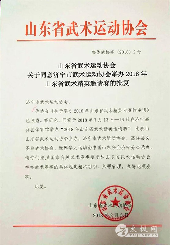 2018年第三届山东省武术精英大赛规程 一、比赛时间:2018年7月13号---16号 二、竞赛地点:济宁市嘉祥体育馆 三、主办单位: 山东省武术运动协会 支持单位: 济宁市体育总会 嘉祥县体育局 嘉祥县体育总会 承办单位: 济宁市武术运动协会 嘉祥县文圣拳武术协会 世界华人运动会中国山东分会济宁分会 协办单位: 济宁市青少年宫 嘉祥县武术协会 中华文圣拳武学研究理事会 嘉祥县太极拳协会 国际酷功夫俱乐部 嘉祥县武术健身运动学校 嘉祥县太极拳学校 嘉祥县泼连拳协会 嘉祥童星功夫教育机构 嘉祥县勇搏悟道教育有限公司 支持媒体: 传统功夫网 中国网·小记者嘉祥运营中心 世界武术网 国际武道联盟官网 中华武术产业网 中华文圣拳官网 济宁市电视台 嘉祥电视台 嘉祥教育电视台 都市传媒 中国武术在线网 嘉祥天艺庆典 嘉祥龙行传媒有限公司 太极网 四、参赛单位:国内外武术团体和个人,包括各省市武术院校、武术协会、武术之乡、各行业体协、大专院校、业余武校(馆) 、中、小学校、武术习练团体及个人等均可报名。 五、竞赛项目: (一)国家规定项目: (1)拳 术:长拳、南拳、太极拳、混合双人太极拳; 短器械:刀术、剑术、南刀、太极剑; 长器械:棍术、枪术、南棍; (2)太极拳:陈式、杨式、武式、吴式、孙式太极拳;24式、42式太极拳。 (3)太极器械:42式、32式太极剑 对 练:二人或三人对练; 集体项目:每队不少于8人,(必须配音乐)。 (4)国家段位规定套路:单练、对练、集体 2、二类:通臂、劈挂、翻子等 3、三类:螳螂、地躺、蛇拳、猴拳、鹰爪等象形拳 4、四类:查拳、华拳、炮拳、洪拳等拳种 5、五类:花拳、佛汉、杂拳等其他拳种 6、传统太极拳:陈式、杨式、武式、吴式、孙式太极拳、其它太极拳 7、文圣拳。 (三)传统器械: 1、传统短器械:长穗剑、反把剑、醉剑、单刀、短棍等; 2、传统长器械:大刀、朴刀、枪术、猴棍等; 3、传统双器械:双刀、双剑、双枪、双钩、双戟、双拐等; 4、传统软器械:九节鞭、三节棍、刀里加鞭、双鞭、流星锤等 5、传统太极器械:太极剑、太极刀、其它太极器械 6、对练:徒手对练、器械对练; 7、集体项目:拳、械﹑双节棍、校园武术操; 8、非物质文化遗产武术展示项目、特色拳种项目:单练、对练、绝技、功法、集体。 六、参加办法: (一)各单位可报多支参赛队,每支队伍可派领队1名、教练员1名、队医1名、运动员若干(男女不限)。 (二)每名运动员限报2项(拳术1项、器械1项),可兼报集体项目。 (三)对练:限2人或3人编组,男、女可混合编组, (四)每单位报集体项目人数不得少于8人,少于8人时不予编排,男、女可混合编组,不设年龄组别。 (五)参赛运动员须持二代身份证参赛,报名时上交身份证复印件、体检证明、责任声明书;运动员必须办理人身意外伤害保险,大会期间发生的伤病事故,各队自负 (六)年龄分组: A组:12岁以下; B组:13岁—17岁; C组:18岁—39岁; D组:40岁—59岁; E组:60岁以上。 七、竞赛办法 (一)比赛执行中国武术协会印发的2012版《传统武术套路竞赛规则》及有关补充规定 (二)传统太极套路必须具有传统风格特点并以传统基本动作为内容的套路形式。出现B级以上(含B级)难度动作不予评分。 (三)本次比赛分为个人单项、对练,集体、比赛。 (四)每单位参加集体项目的运动员不得少于8人,每少1人,在本队集体项目的最后得分中扣0.5分。 (五)项目时间: 八、录取名次与奖励办法 1、竞赛项目按各项、男女分别设一等奖20%、二等奖40%、三等奖40%,颁发获奖证书和奖牌。 2、传统项目:按各单项各年龄组别、男女分别设一等奖20%、二等奖40%、三等奖40%,颁发获奖证书和奖牌,录取比例均按照实际参赛人数,采取四舍五入的办法。 各单项各组别男、女报名人数在5人(含5人)以下时,按同类项目相近年龄组别合并,如仍不足5人,则按不同项目相同年龄组别合并,男、女分别录取。 3、集体项目比赛:按拳、械、分设一、二、等奖录取(武术操项目另立)。 4、集体获奖项目:根据成绩颁发一等奖40%、二等奖60%,大赛组委会颁发获奖证书奖牌。 5,非物质文化遗产武术展示项目;特色拳种项目:颁发证书,精致牌匾。 6,评选: “优秀教练员奖”、“优秀裁判员奖”、“优秀领队奖”、“贡献奖”、“体育道德风尚奖”。(评选办法另行通知) 7、(1)凡在2018年6月1号以前完成报名手续者,大会赠送精美礼品。 (2)评选一类拳、二类拳、三类拳、四类拳、五类拳、太极拳、文圣拳、长器械、短器械、软器械各大项每组一名“冠军”颁发证书和1.2米高仿古桃木剑。(武德、赛场表现突出,男、女每组合并达18人评奖,达不到18人不参与评奖) (3)团体总分录取前六名。第一名颁发获奖牌匾和奖金人民币3000元,第二名颁发获奖牌匾和奖金人民币2000元,第三名颁发获奖牌匾和奖金人民币1000元,第四名至第六名颁发获奖牌匾和奖金800元、500元、300元。 积分方法:按照本次大赛报名人数最多的前8名计分,个人项目和集体项目一等奖积5分,二等奖积3分,三等奖积1分。按各队总积分排列,分值高者列前。若总积分相等,以获一等奖多者列前。若仍相等,以获得二等奖多者列前,以此类推。参赛不足15人的队伍,不予计算团体成绩 8、授予段位称号(只限本省运动员、不能逐级升段) 1、A组按实际参赛人数的5%的比例授予三段称号;10%的比例授予二段称号;70%的比例授予一