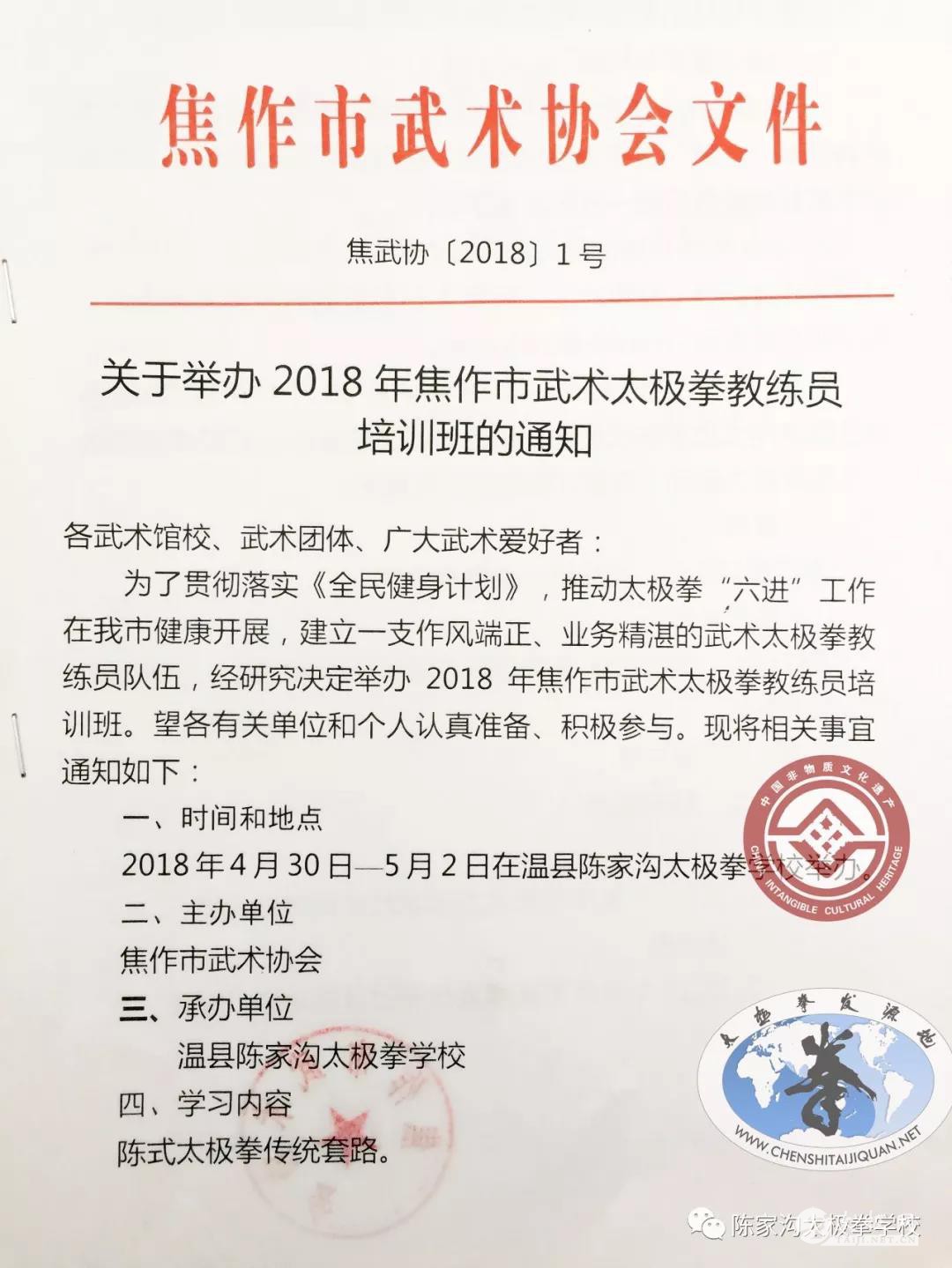 为贯彻落实《全民健身计划》,推动太极拳“六进”工作的开展,建立一支作风端正、业务精湛的太极拳教练员队伍,经焦作市武术协会研究决定,“2018年焦作市太极拳教练员培训班”将于2018年4月30日至5月2日在陈家沟太极拳学校举办。 同时,为进一步完善“中国陈家沟陈式太极拳国际交流大赛”的裁判员队伍,大赛组委会也会在本次培训班中聘请优秀教练员,参与到今年即将在陈家沟举办的第四届交流大赛中担任裁判员。 陈家沟太极拳学校 |