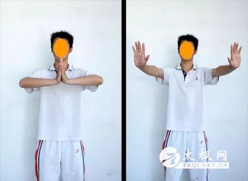 身体直立,两掌相对,十指朝上,双手在胸前膻中穴合十击掌,然后两掌分开,深呼气双脚微微踮起,慢慢将双手以人字形推开。重复以上动作,劳宫相对,共拍打36次。